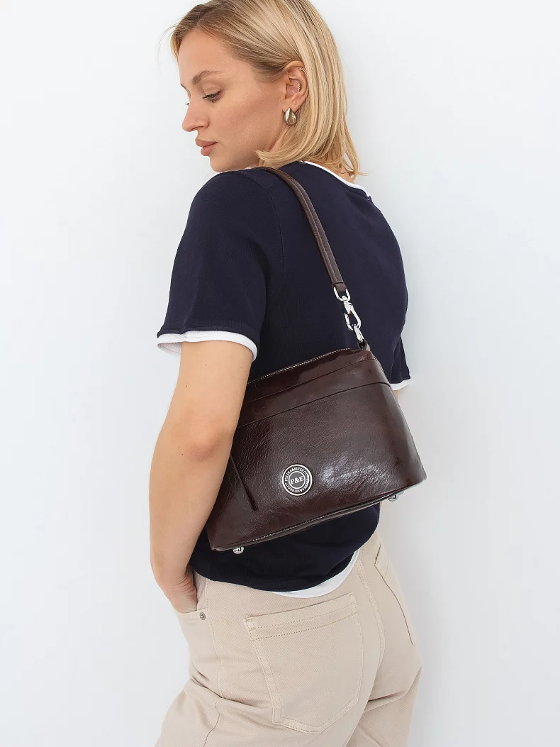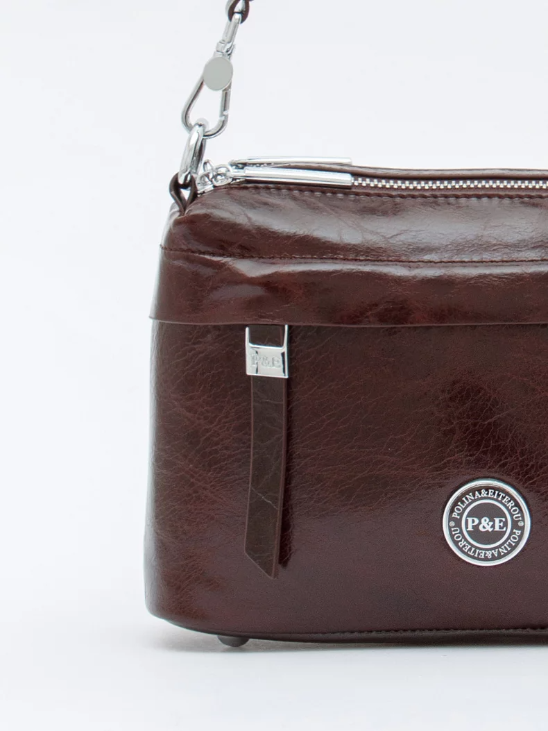 Сумка кросс-боди, выполнена из натуральной кожи. Декорирована логотипом на передней части. Дополнена  серебристой фурнитурой. Данная модель закрывается на молнии. Каркас полужесткий. Носится на плече. В комплекте имеется съёмный плечевой ремень с регулировкой длины. Или в руке за съемную ручки.