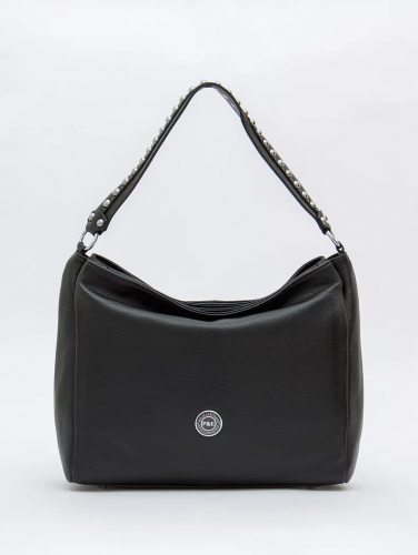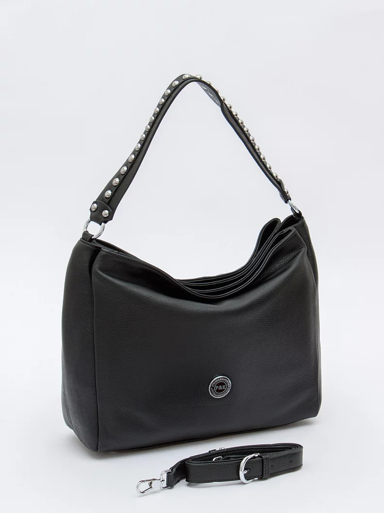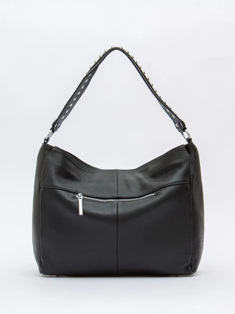 Базовая модель, выполнена из натуральной кожи. Декорирована клепками на ручке. Дополнена серебристой фурнитурой. Данная модель закрывается на молнии, носится в руке за встроенную ручку. Или на плече, в комплекте имеется ремень с регулировкой длины. Каркас мягкий. На дне предусмотрены ножки.