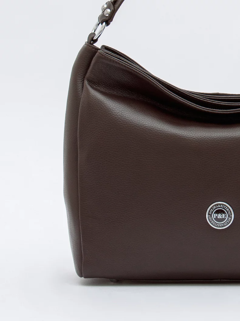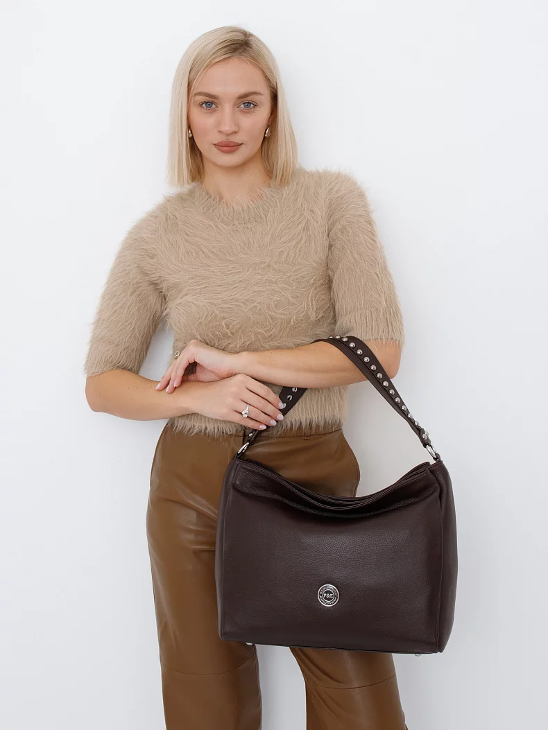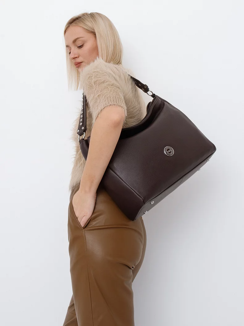 Базовая модель, выполнена из натуральной кожи. Декорирована клепками на ручке. Дополнена серебристой фурнитурой. Данная модель закрывается на молнии, носится в руке за встроенную ручку. Или на плече, в комплекте имеется ремень с регулировкой длины. Каркас мягкий. На дне предусмотрены ножки.