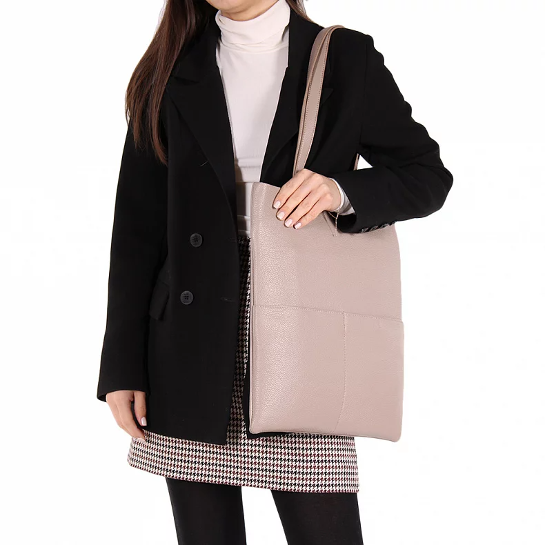 Модель-шоппер формата А4, выполнена из натуральной кожи. Дополнена серебристой фурнитурой. Данная модель закрывается на молнию. Каркас мягкий. Носится в руке за встроенные ручки.