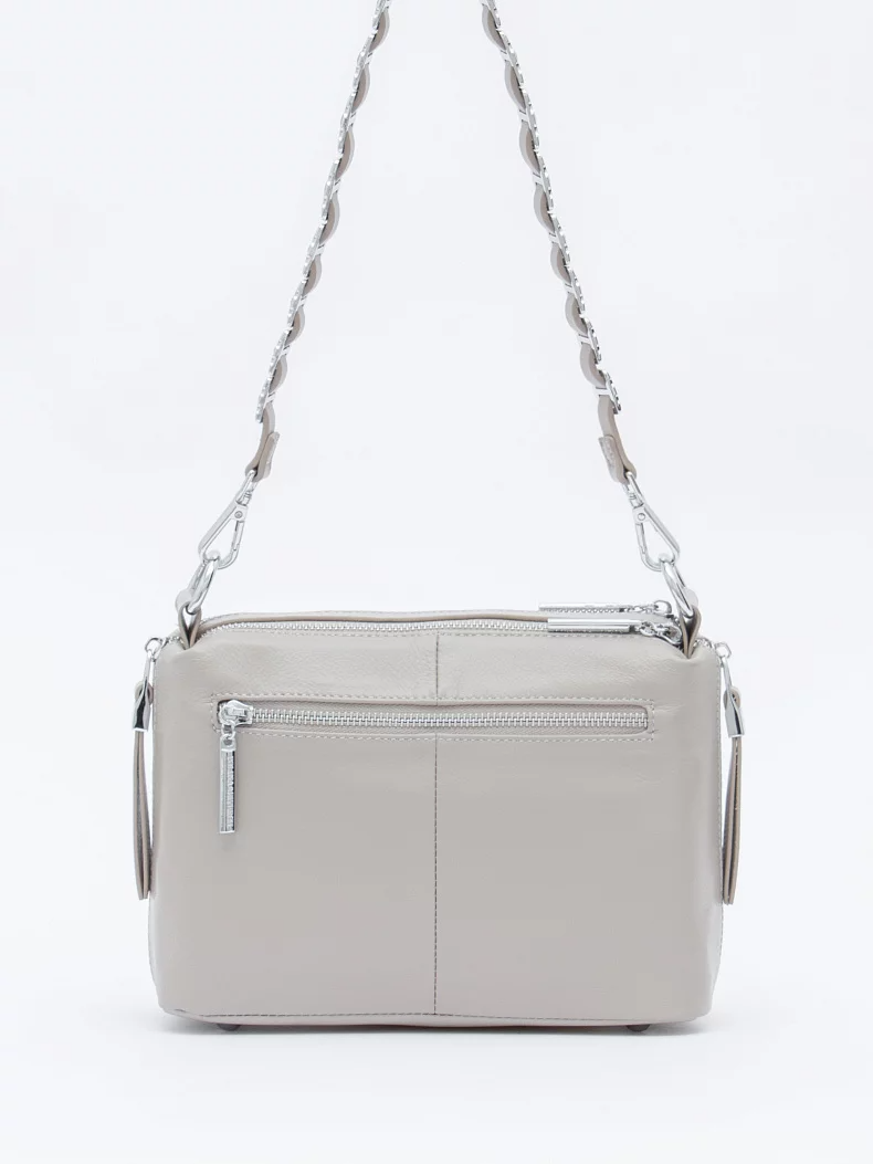 Базовая сумка, выполнена из кожи. Дополнена серебристой фурнитурой. Данная модель закрывается на молнии. Каркас мягкий. Носится в руке или на плече. В комплекте удлиненная ручка и длинный плечевой ремень.