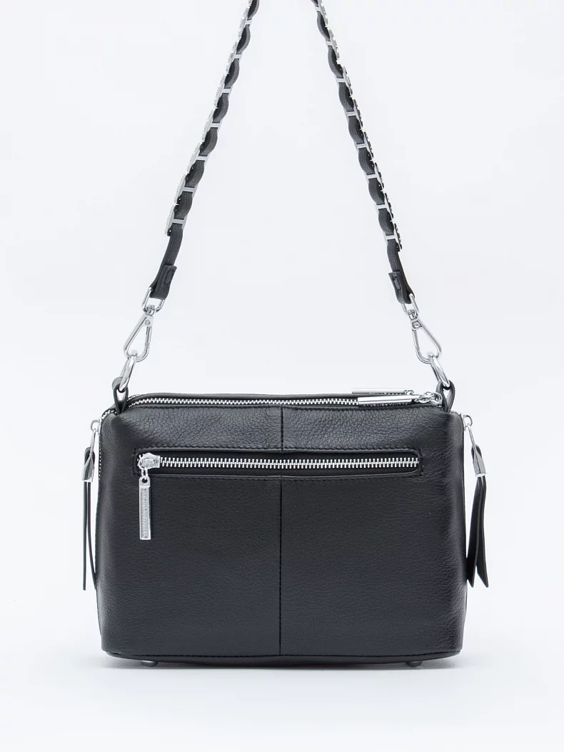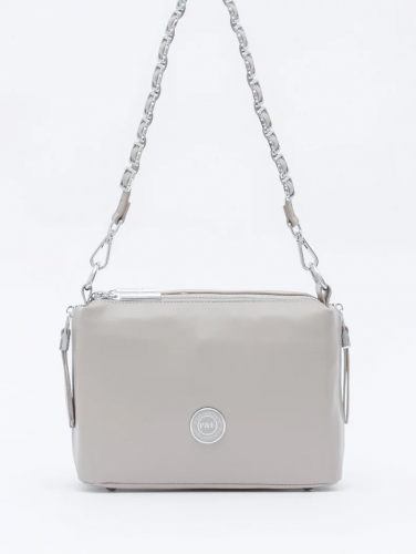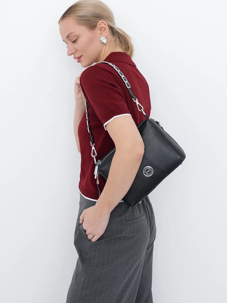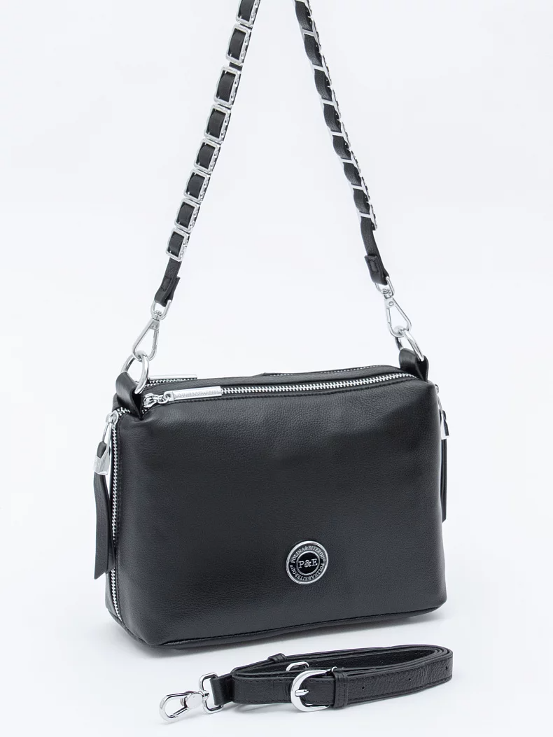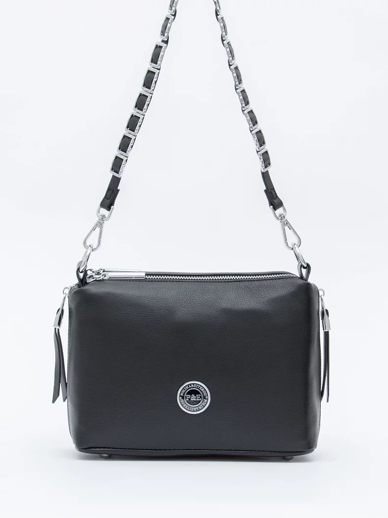 Базовая сумка, выполнена из кожи. Дополнена серебристой фурнитурой. Данная модель закрывается на молнии. Каркас мягкий. Носится в руке или на плече. В комплекте удлиненная ручка и длинный плечевой ремень.