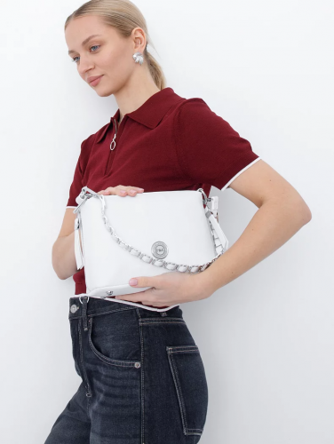 Базовая сумка, выполнена из кожи. Дополнена серебристой фурнитурой. Данная модель закрывается на молнии. Каркас мягкий. Носится в руке или на плече. В комплекте удлиненная ручка и длинный плечевой ремень.