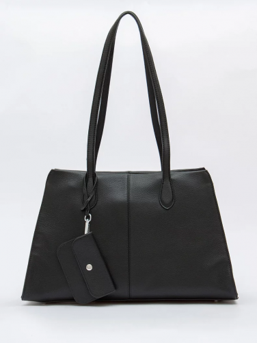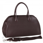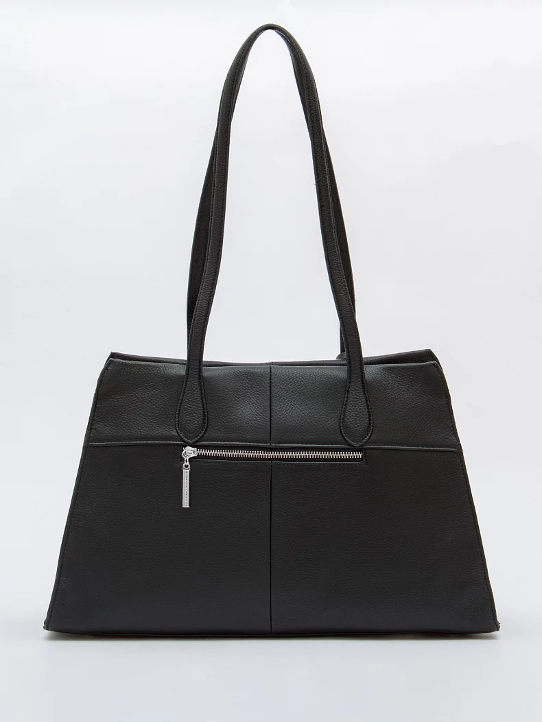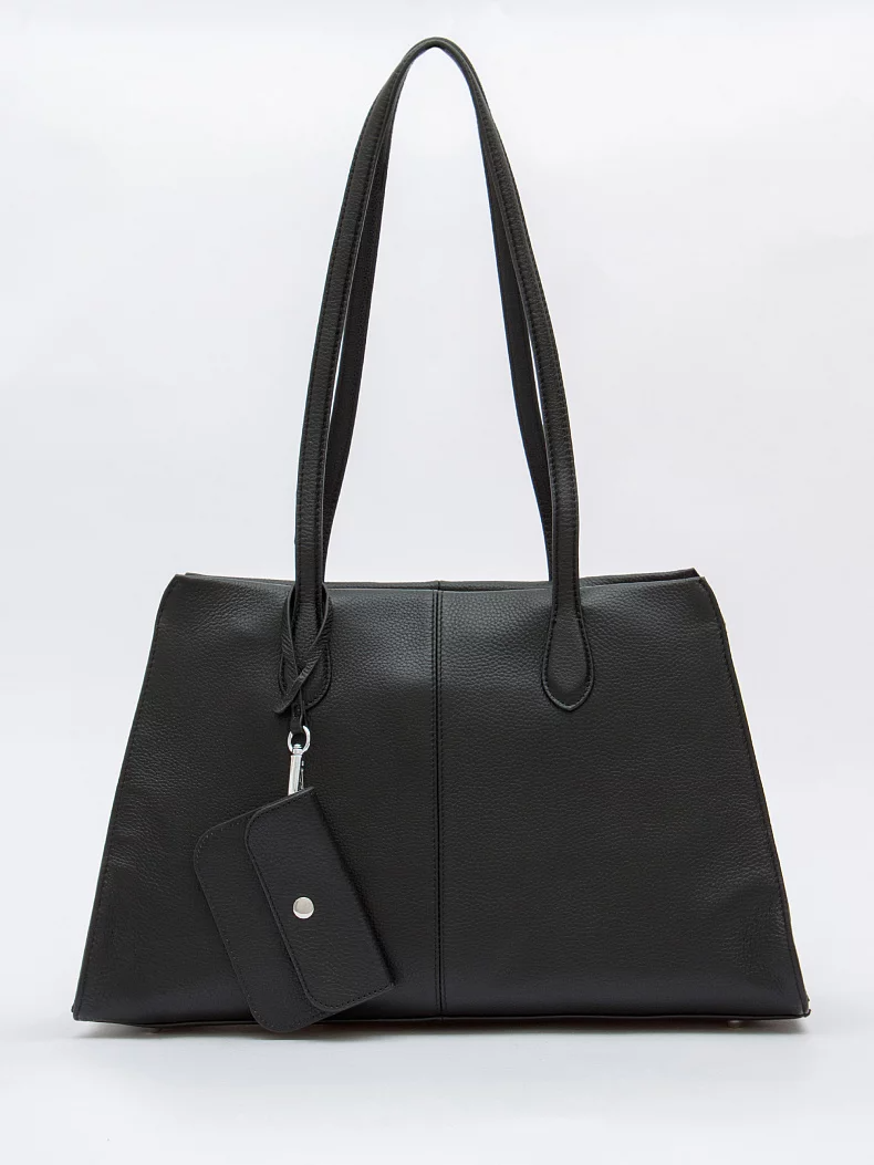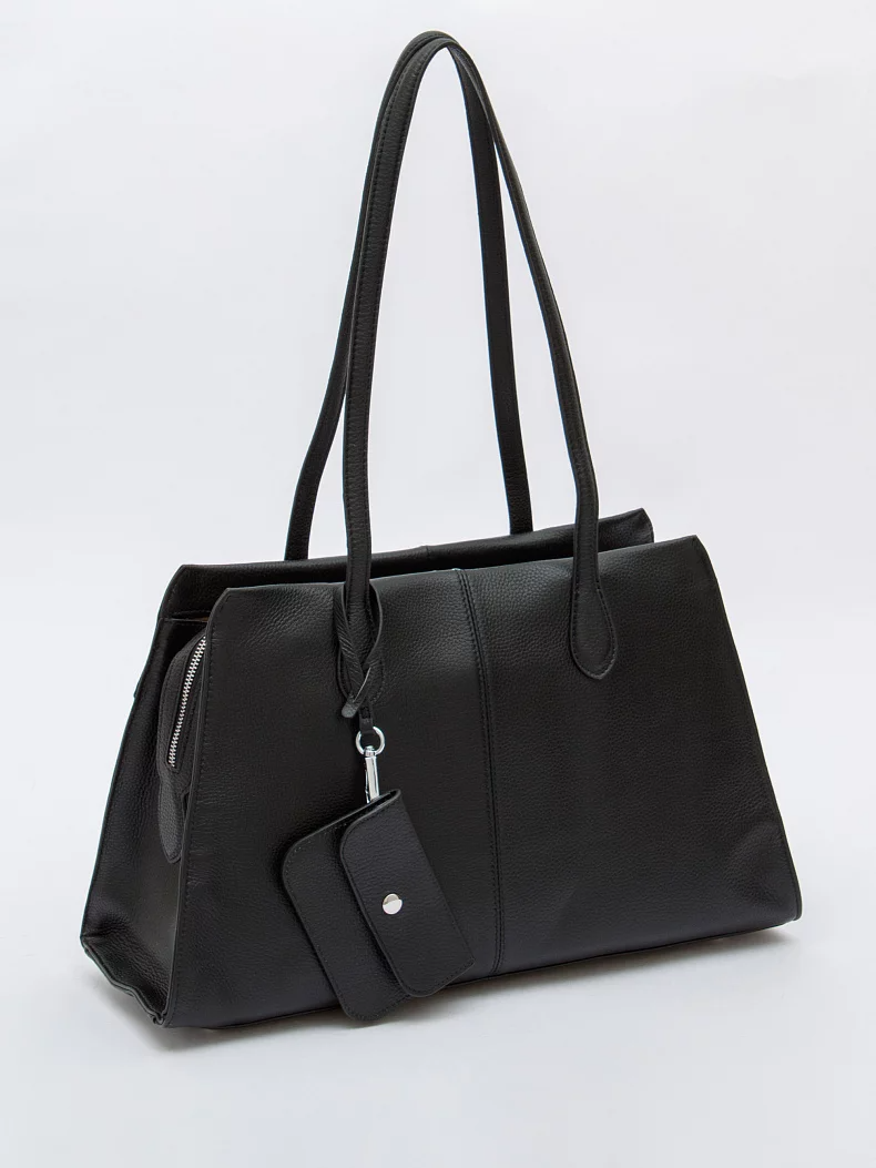 Вместительная сумка, выполнена из натуральной кожи. Дополнена серебристой фурнитурой. Данная модель закрывается на молнию, носится в руке за встроенные ручки. Или на плече. Каркас полужесткий. На дне предусмотрены ножки. В комплекте имеется съемный кошелек.