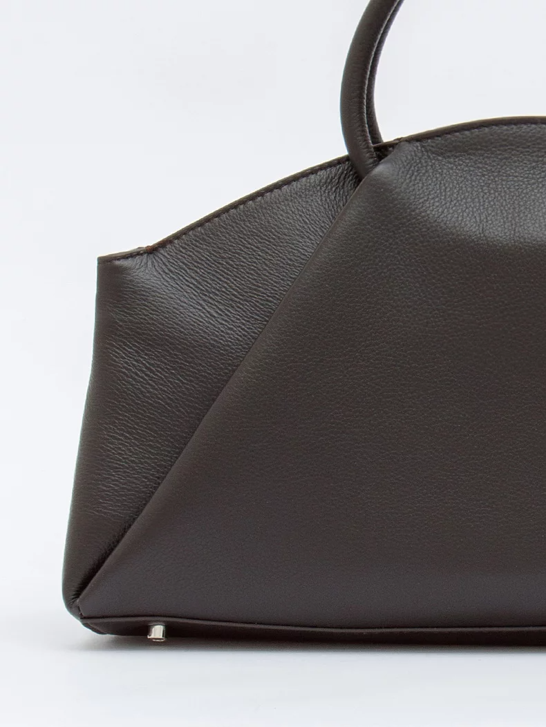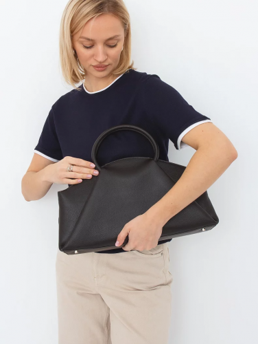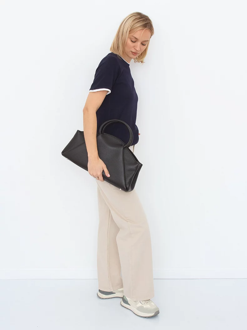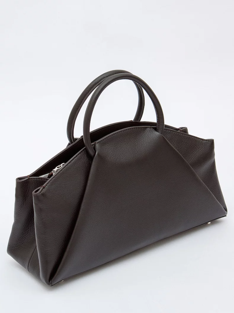 Модель с акцентными ручками, выполнена из натуральной кожи. Декорирована складками на корпусе. Дополнена серебристой фурнитурой. Данная модель закрывается на молнию, носится в руке за встроенные ручки. Или на плече, в комплекте имеется ремень с регулировкой длины. Каркас полужесткий.