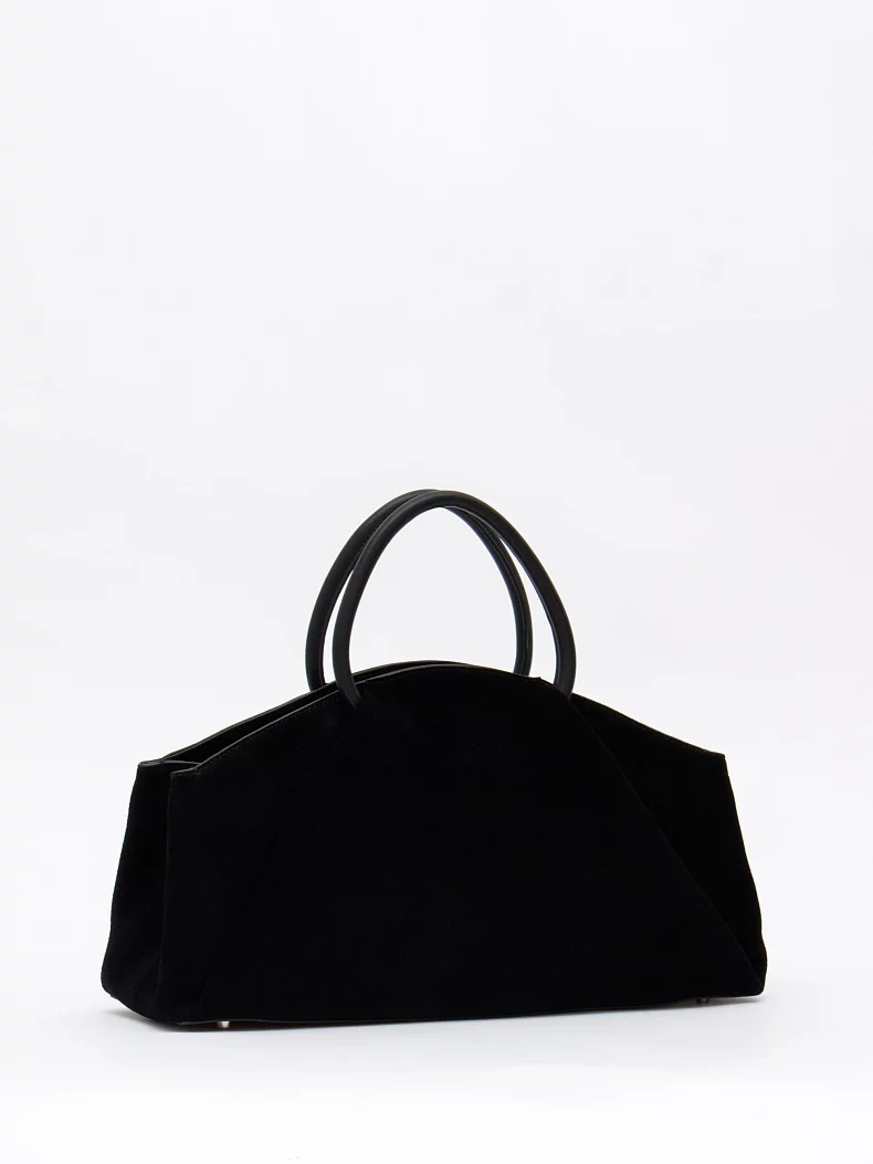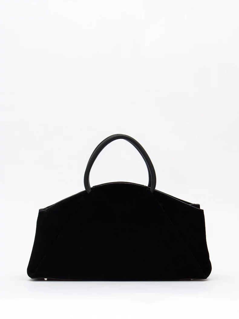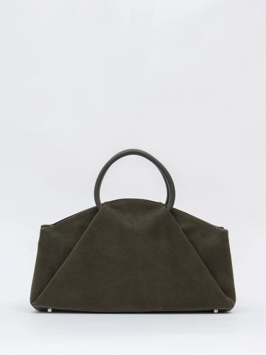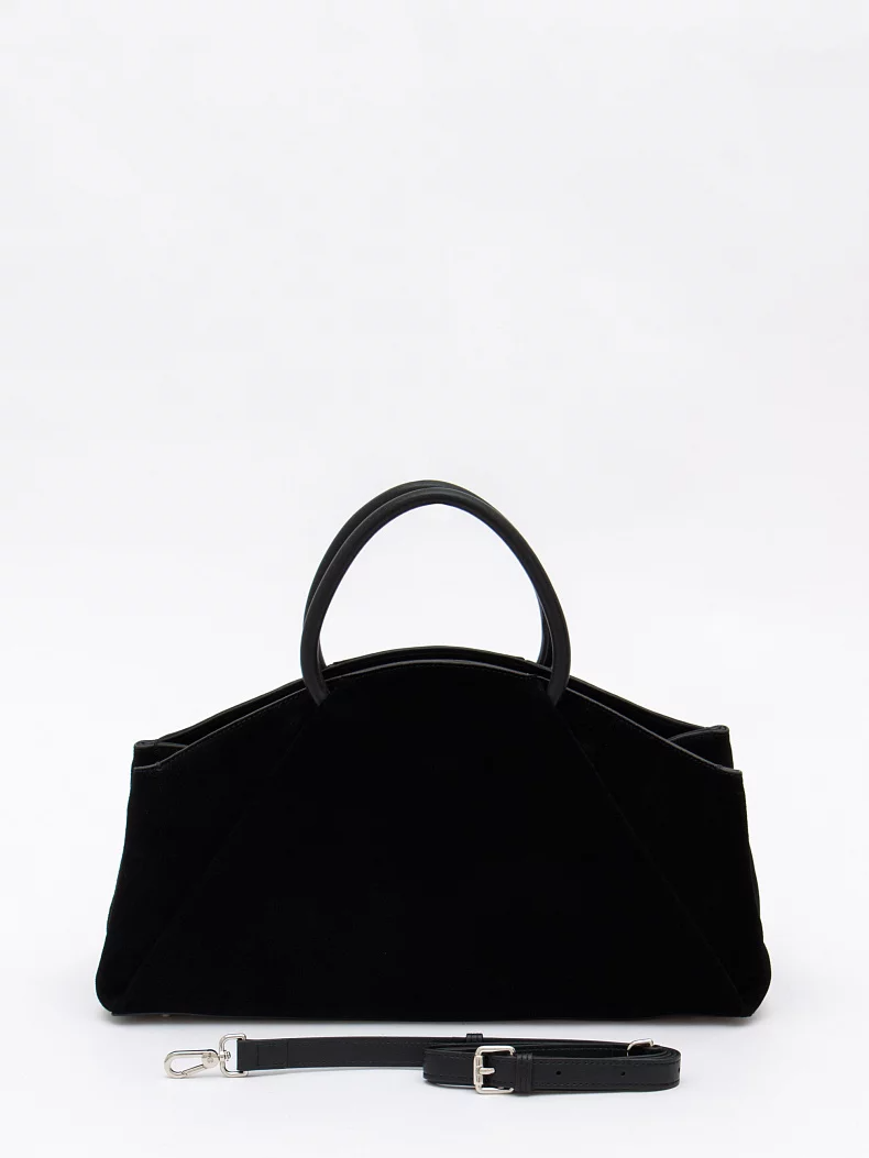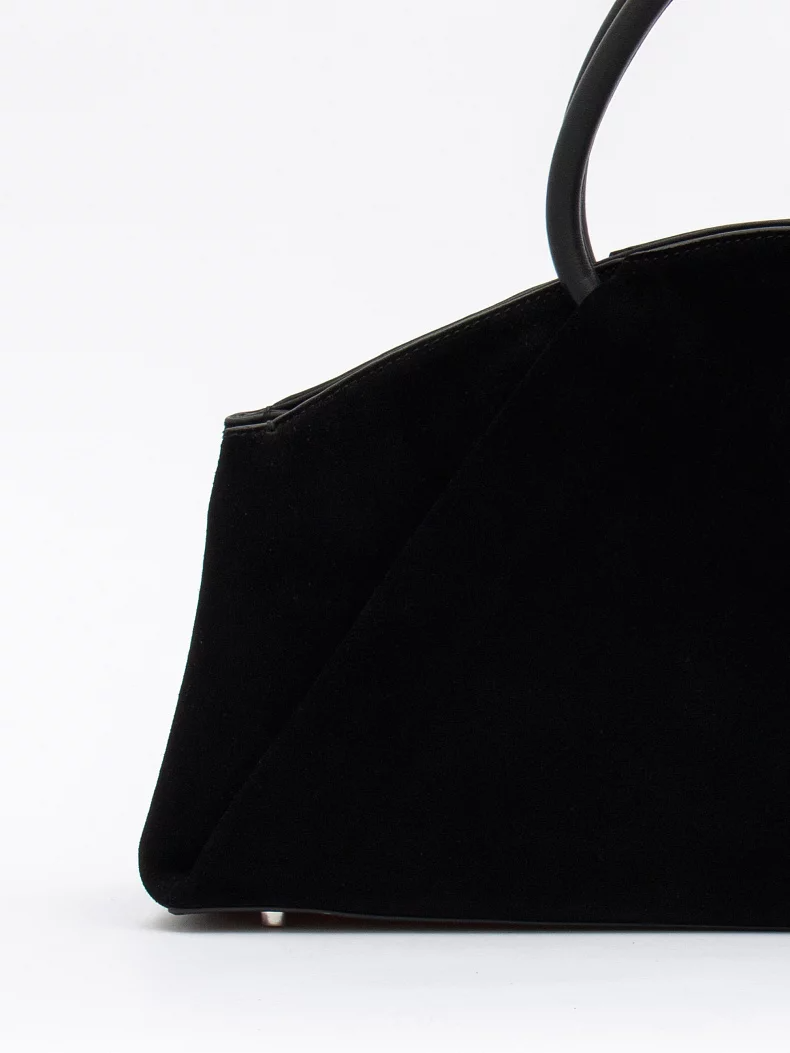 Модель с акцентными ручками, выполнена из натуральной замши. Декорирована складками на корпусе. Дополнена серебристой фурнитурой. Данная модель закрывается на молнию, носится в руке за встроенные ручки. Или на плече, в комплекте имеется ремень с регулировкой длины. Каркас полужесткий.