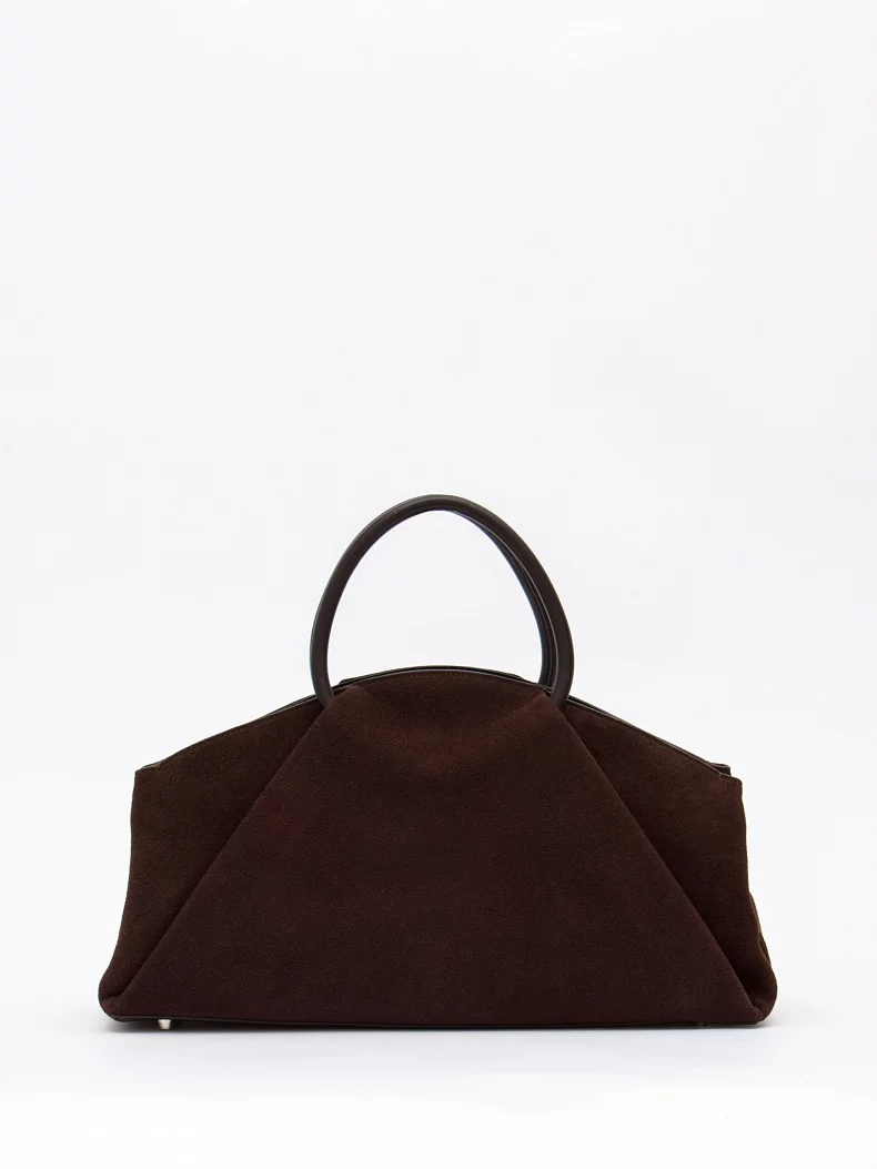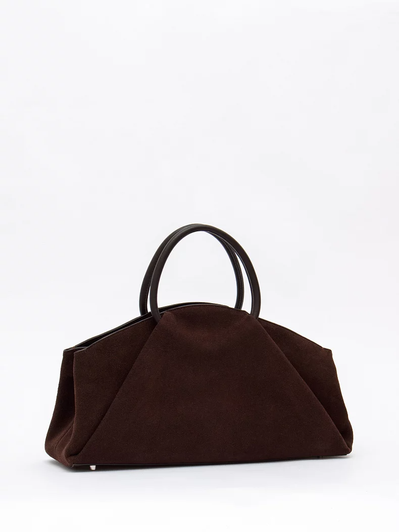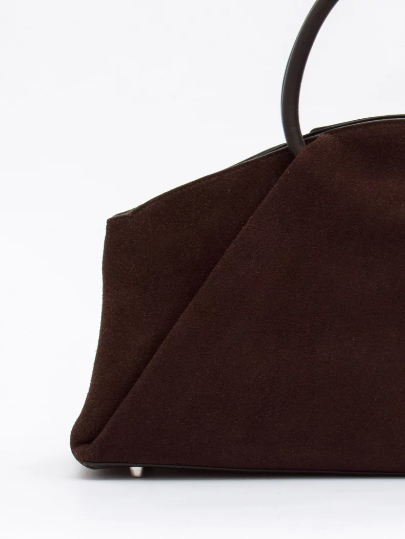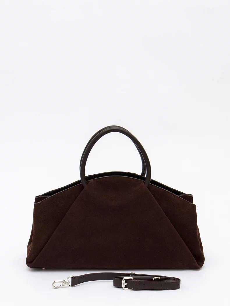 Модель с акцентными ручками, выполнена из натуральной замши. Декорирована складками на корпусе. Дополнена серебристой фурнитурой. Данная модель закрывается на молнию, носится в руке за встроенные ручки. Или на плече, в комплекте имеется ремень с регулировкой длины. Каркас полужесткий.