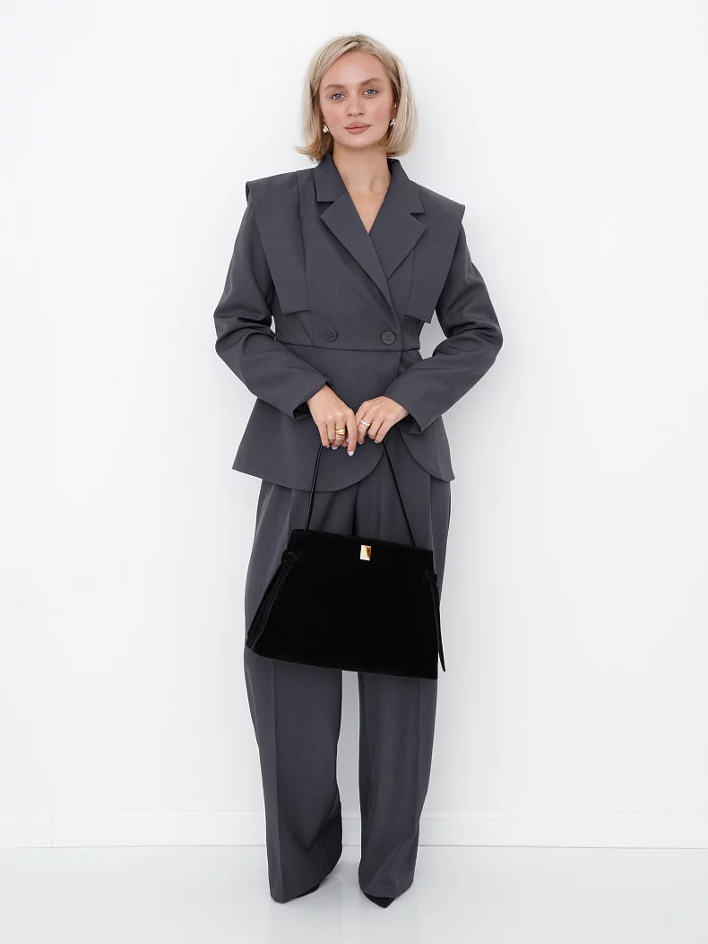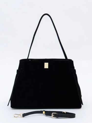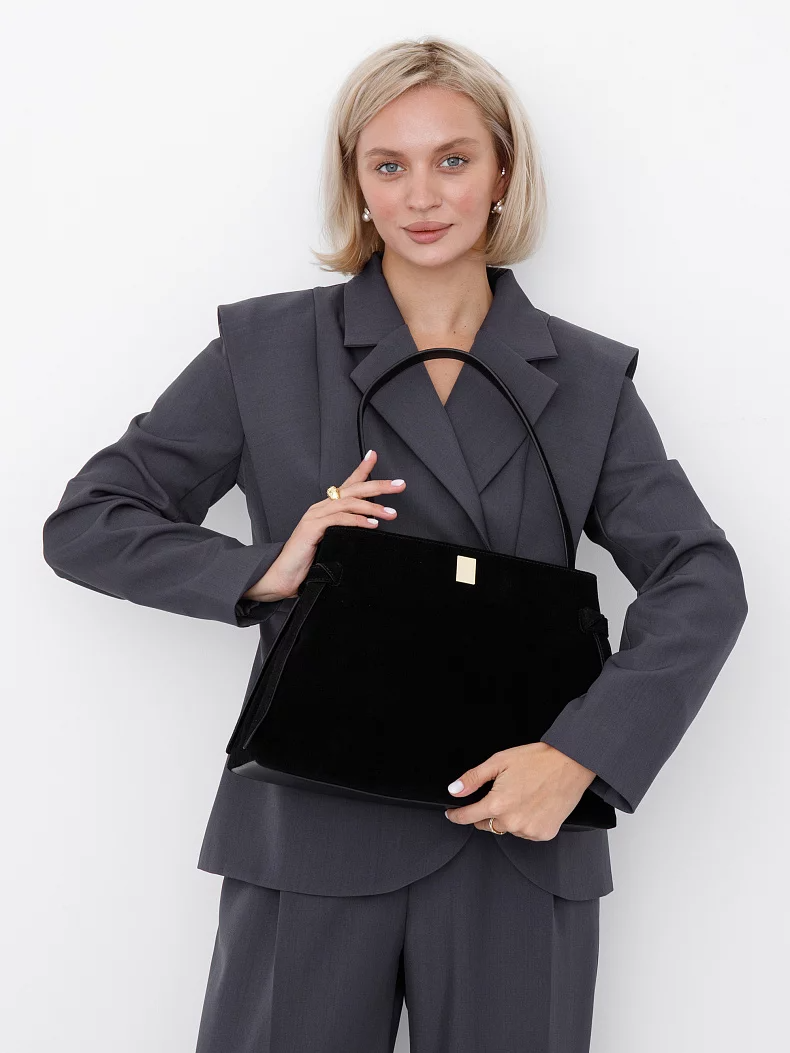 Вместительная модель, выполнена из замши. Дополнена золотистой фурнитурой. Данная модель закрывается на молнию, носится в руке за или на плече за встроенные ручки. Каркас жесткий.