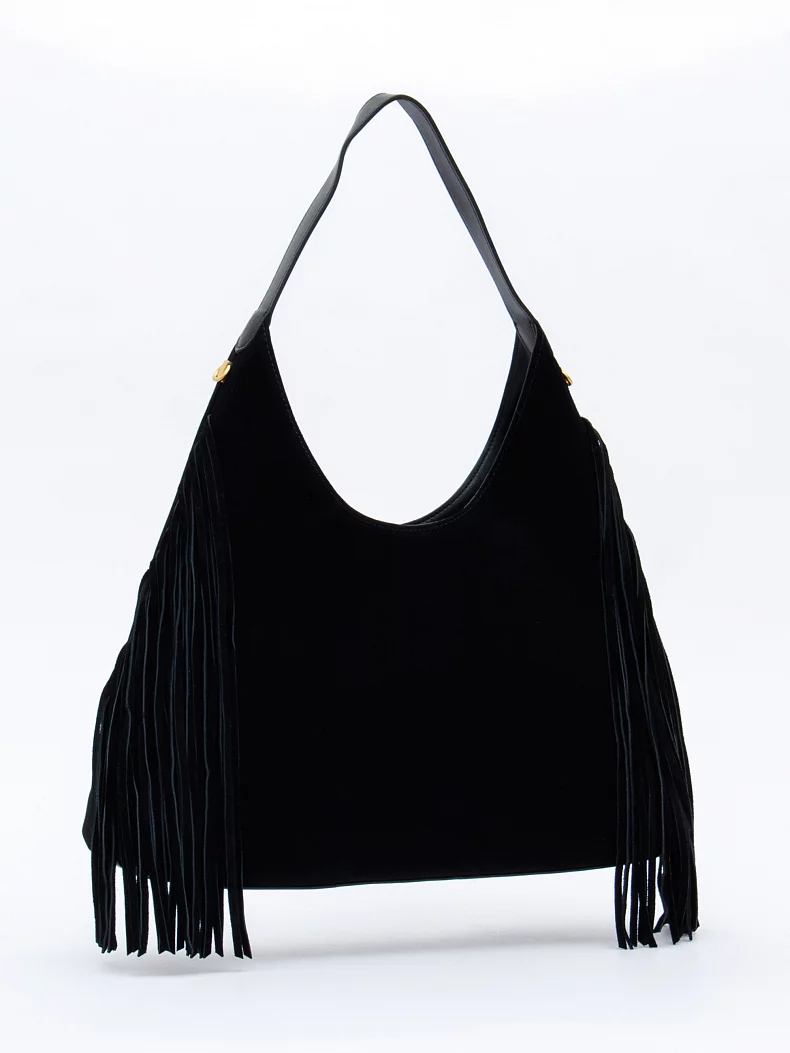 Сумка-хобо, выполнена из замши. Декорирована бахромой. Дополнена золотистой фурнитурой. Данная модель закрывается на молнию, носится в руке за встроенную ручку или на плече. В комплекте имеется съемный ремень с регулировкой длины. Каркас полужесткий.