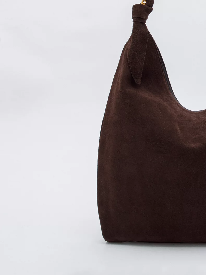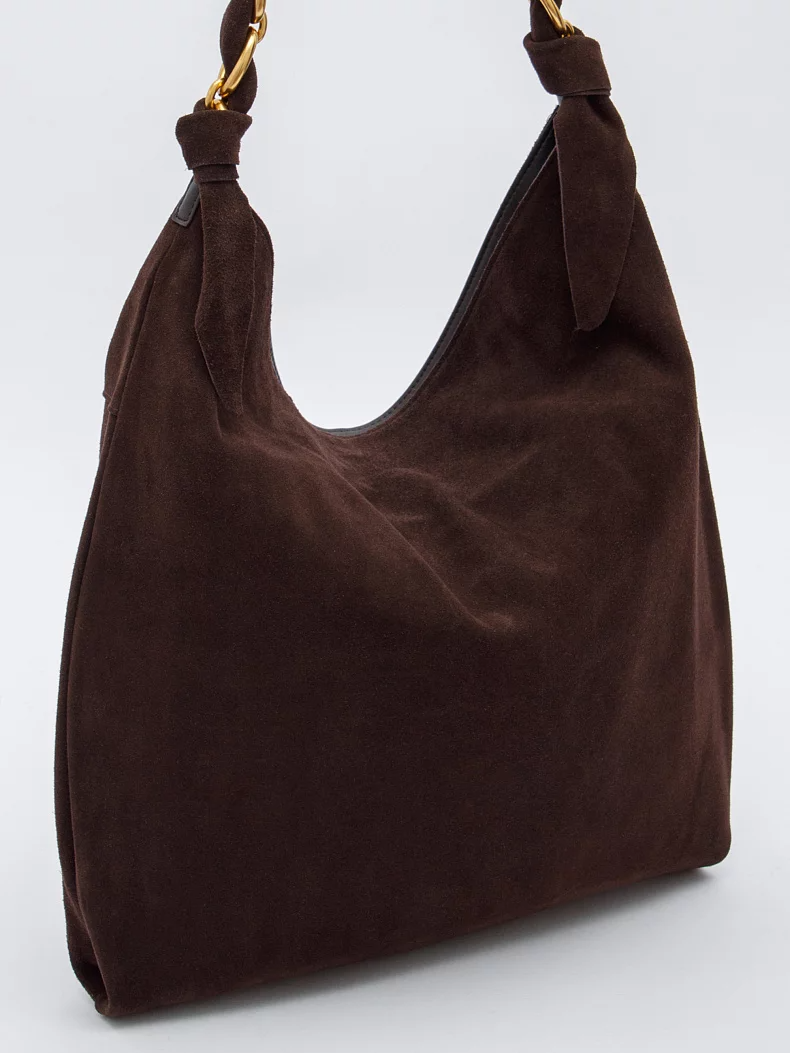 Вместительная модель, выполнена из замши. Декорирована цепочкой на ручке. Дополнена золотистой фурнитурой. Данная модель закрывается на молнию. Каркас мягкий. Носится в руке или на плече за встроенную удлиненную ручку.