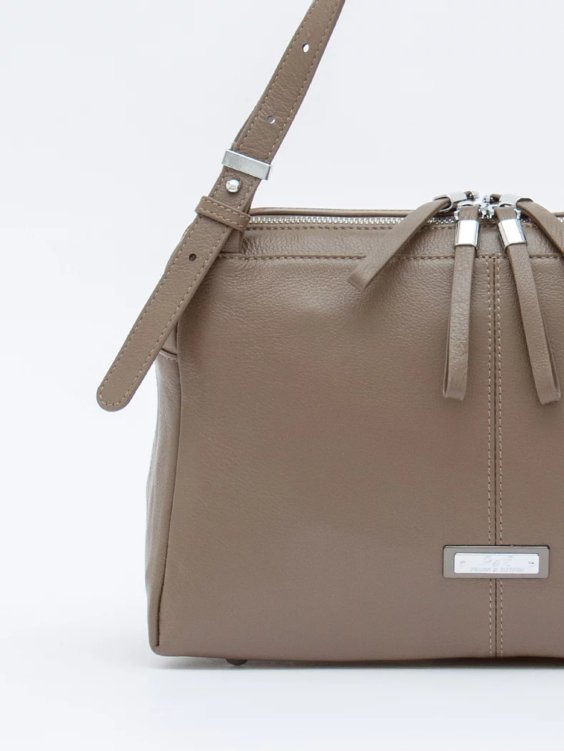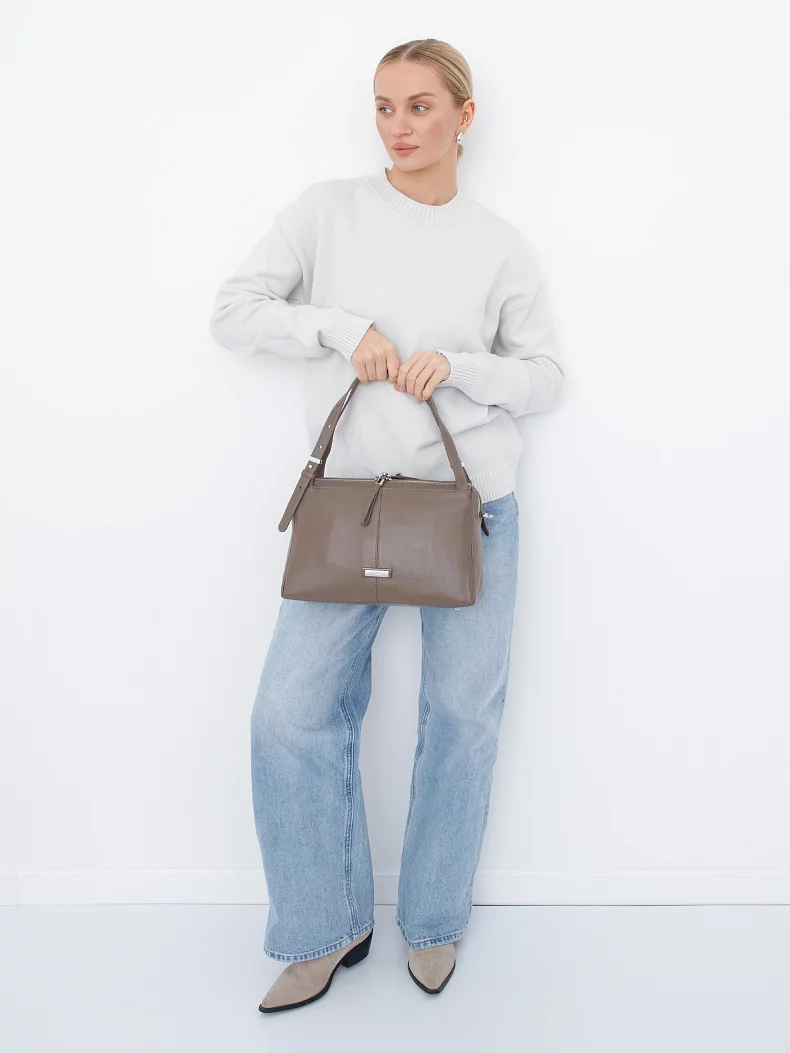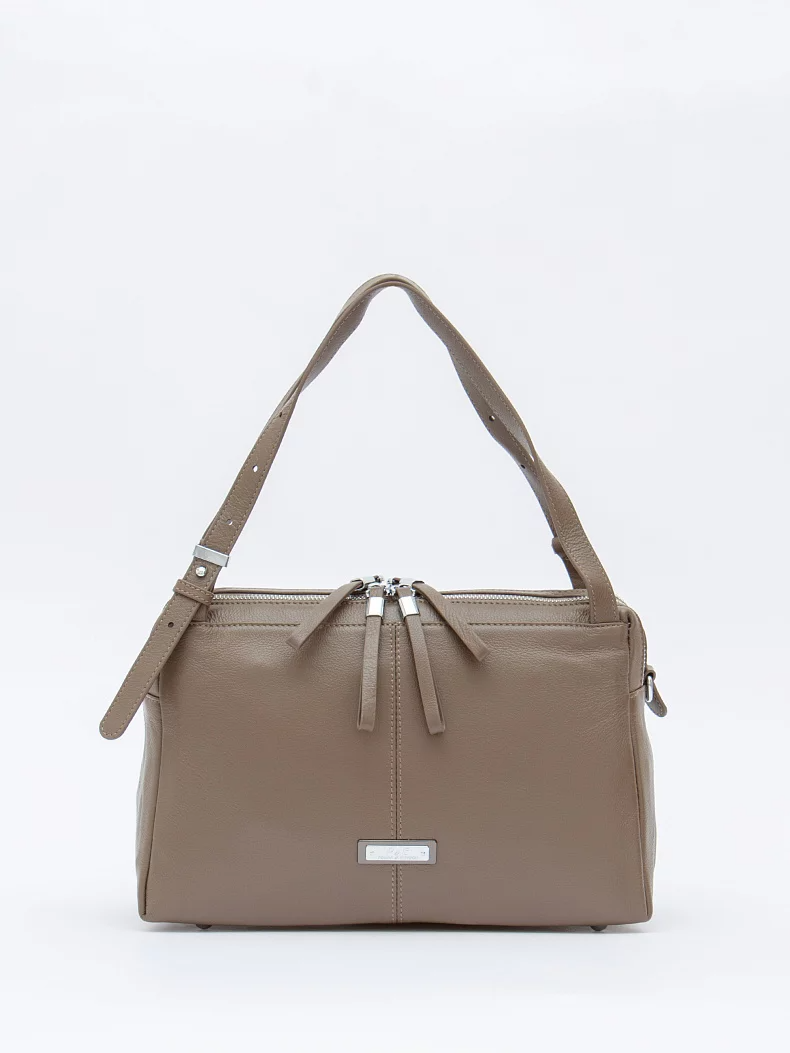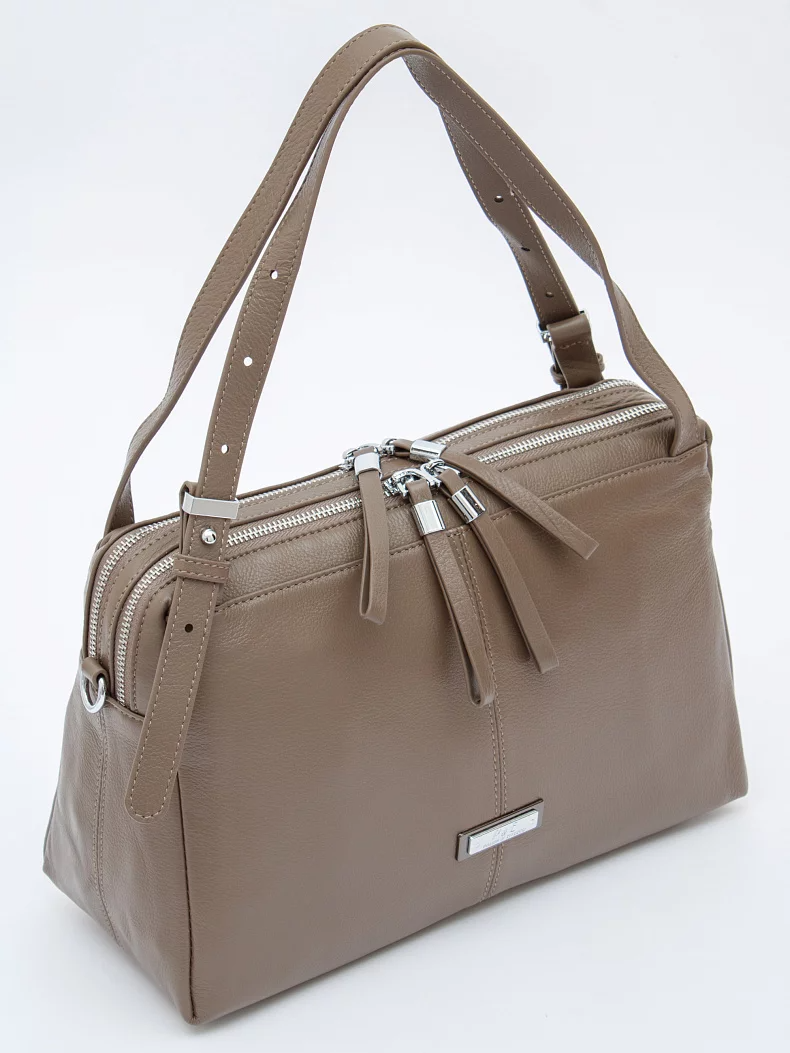 Базовая сумка, выполнена из натуральной кожи. Дополнена серебристой фурнитурой.  Данная модель закрывается на молнии. Носится в руке за встроенные ручки с регулировкой длины и на плече, съемный ремень регулируется по длине. Каркас мягкий. На дне предусмотрены ножки.