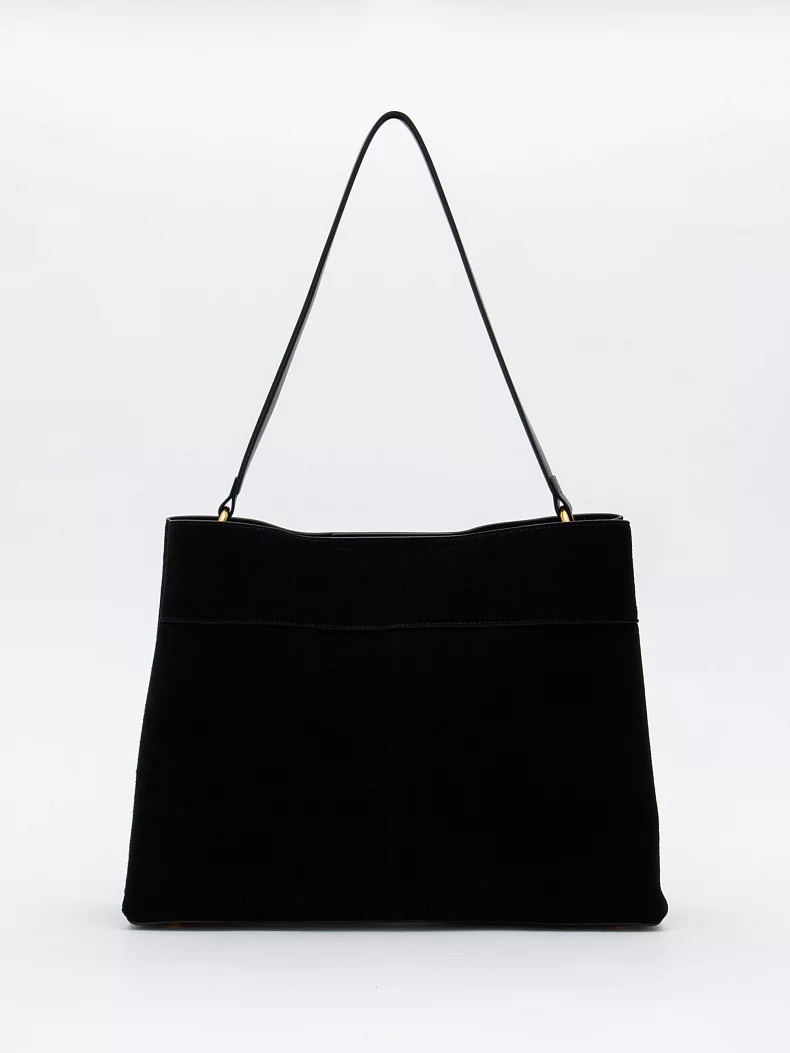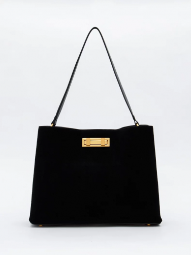 Эффектная модель, выполнена из замши.  Дополнена золотистой фурнитурой. Данная модель закрывается на вертушку. Каркас мягкий. Носится в руке за встроенную удлиненную ручку или на плече. В комплекте имеется съемный ремень с регулировкой длины. На дне предусмотрены ножки.