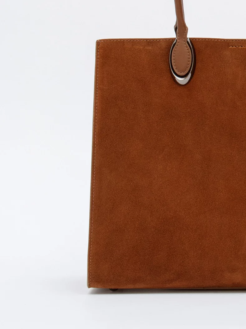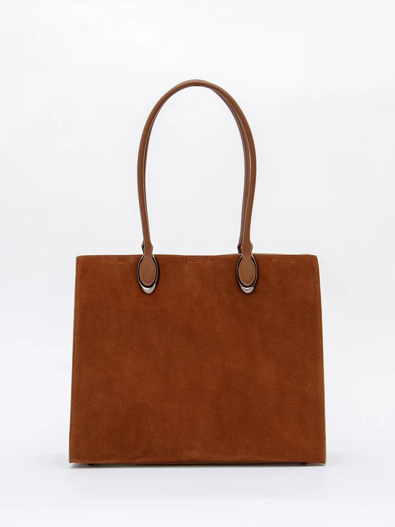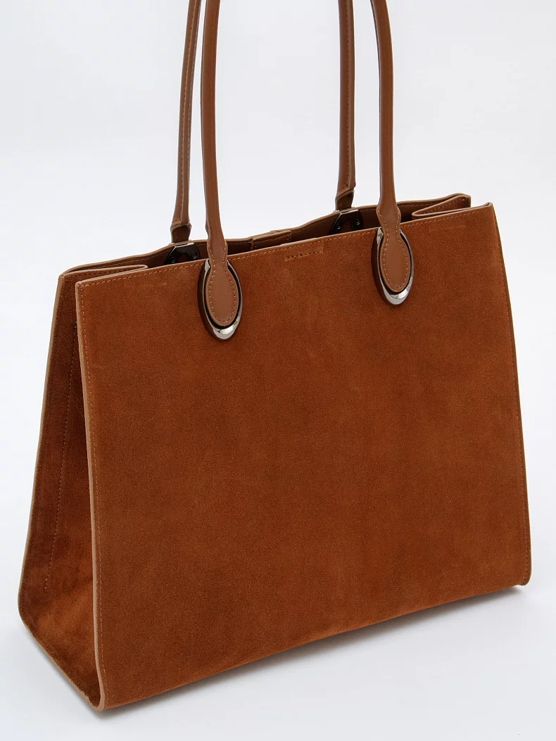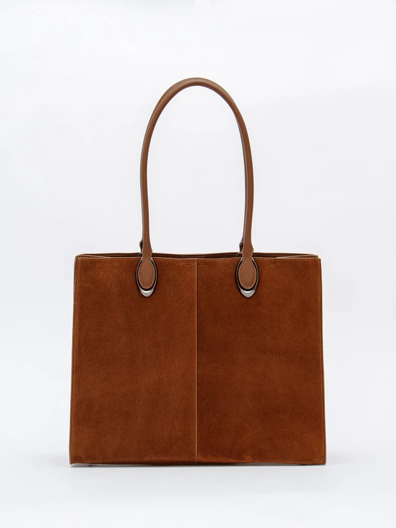 Стильная модель-тоут, выполнена из замши. Дополнена серебристой фурнитурой. Данная модель закрывается на молнию. Каркас жесткий. Носится в руке или на плече за встроенные удлиненные ручки.