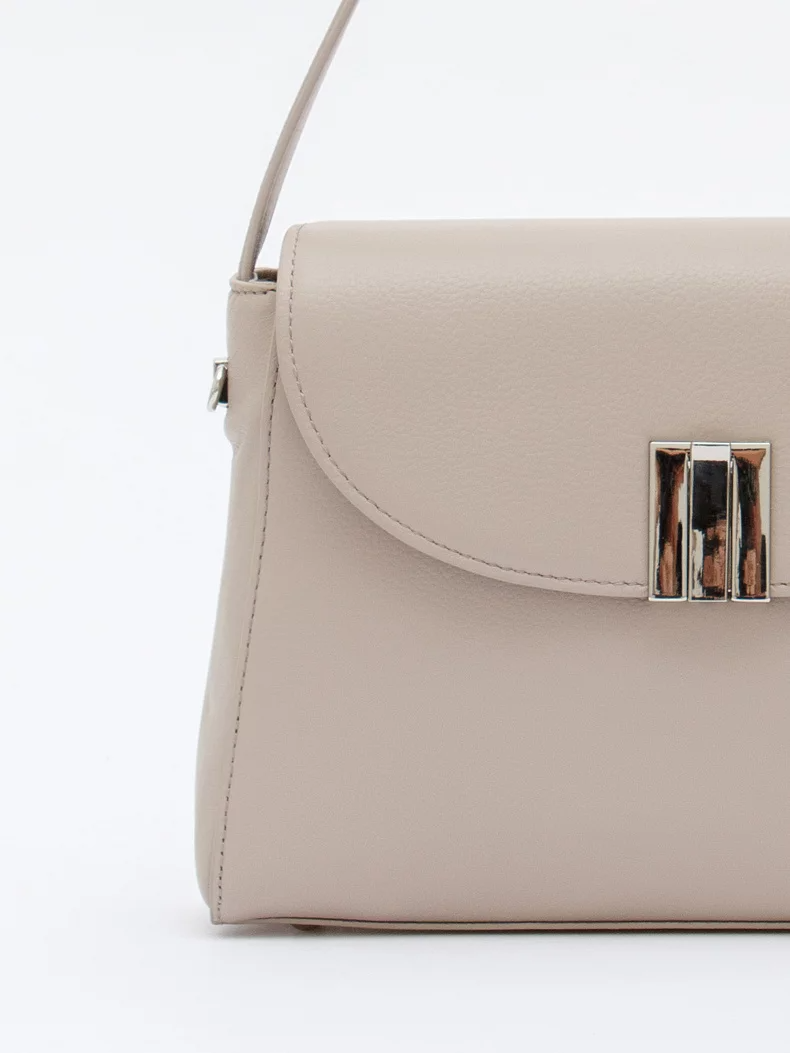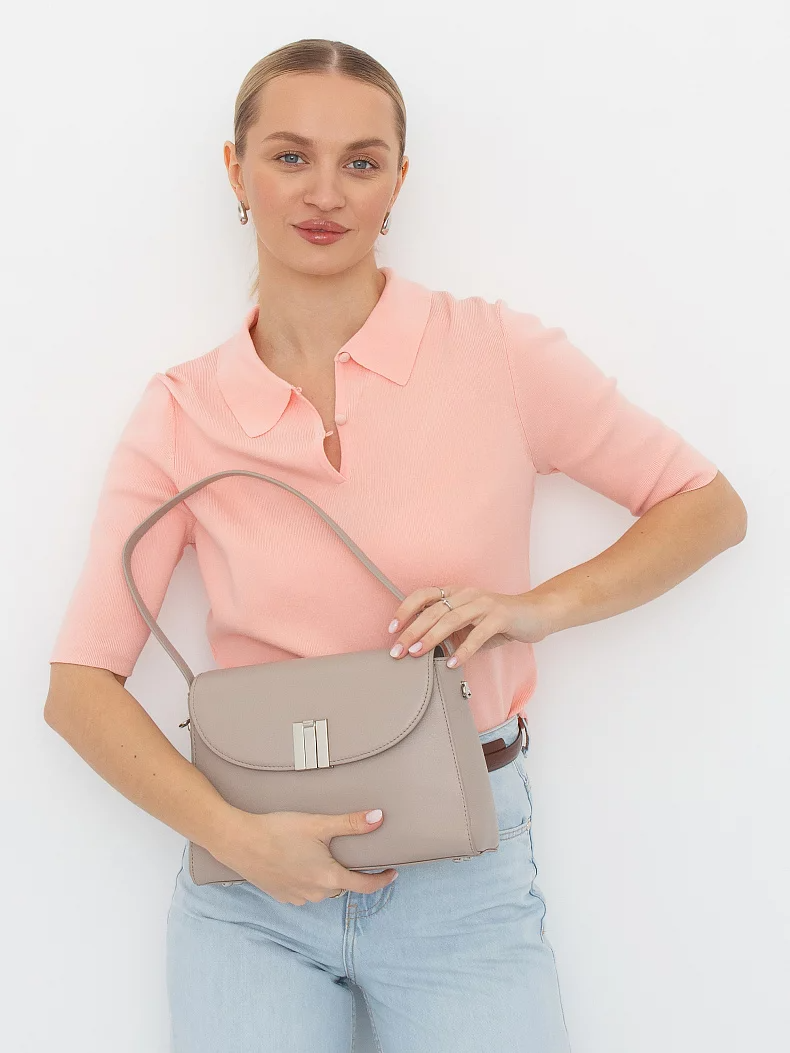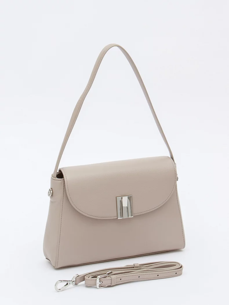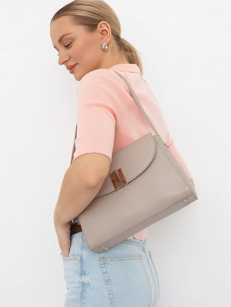 Базовая модель, выполнена из кожи. Декорирована пряжкой на клапане. Дополнена серебристой фурнитурой. Данная модель закрывается на клапан. Каркас полужесткий. Носится в руке за встроенную ручку или на плече. В комплекте имеется съемный ремень с регулировкой длины. на дне предусмотрены ножки.
