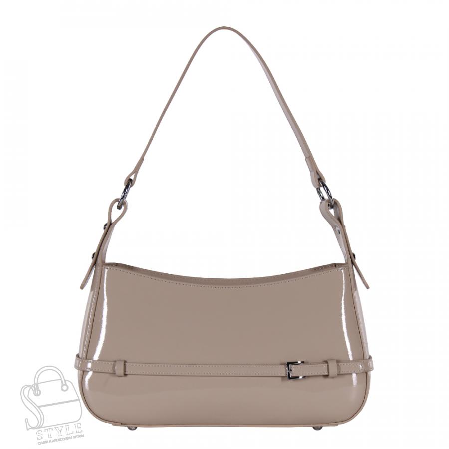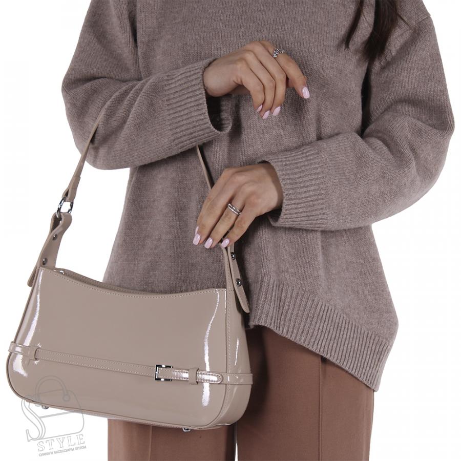 Сумка-багет, выполнена из лаковой натуральной кожи. Декорирована ремнем на передней части. Дополнена серебристой фурнитурой. Данная модель закрывается на молнию, носится в руке или на плече. В комплекте имеется съемный ремень с регулировкой длины и удлиненная ручка. Каркас полужесткий. На дне предусмотрены ножки.