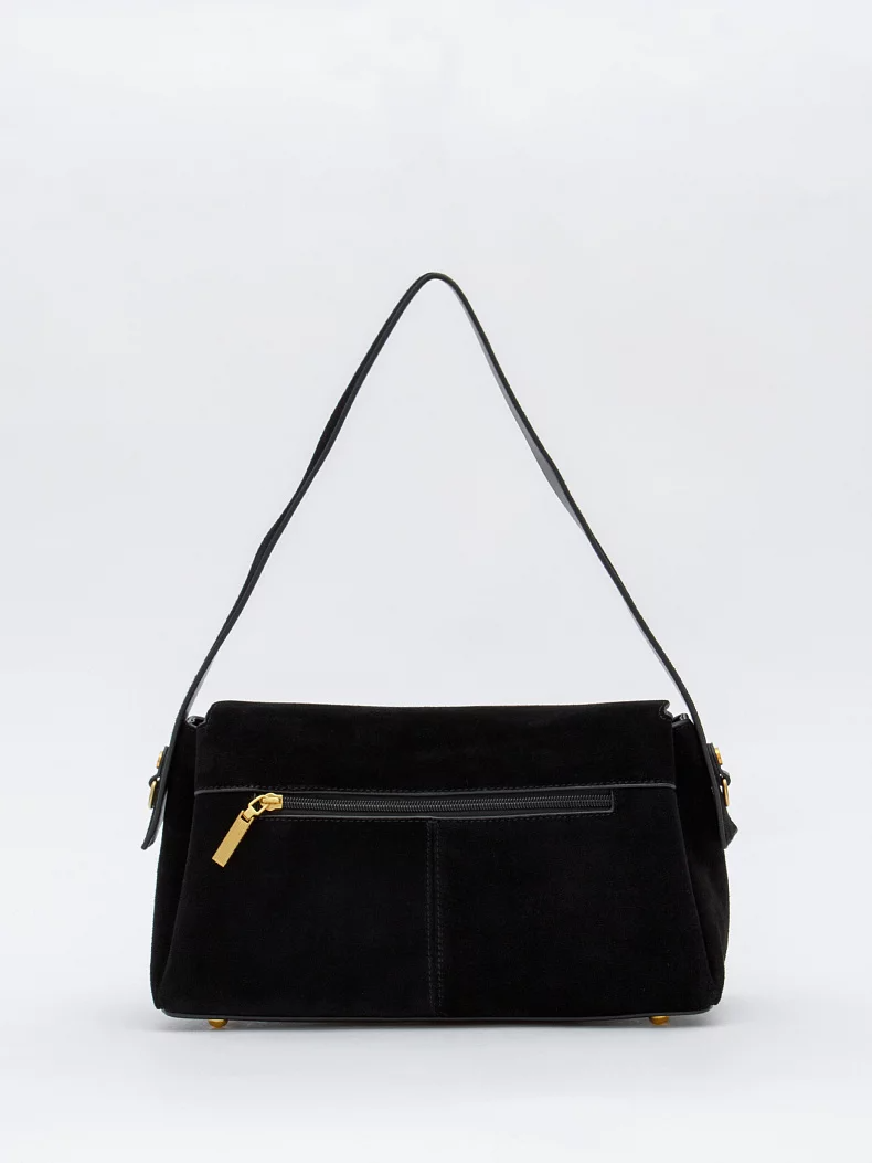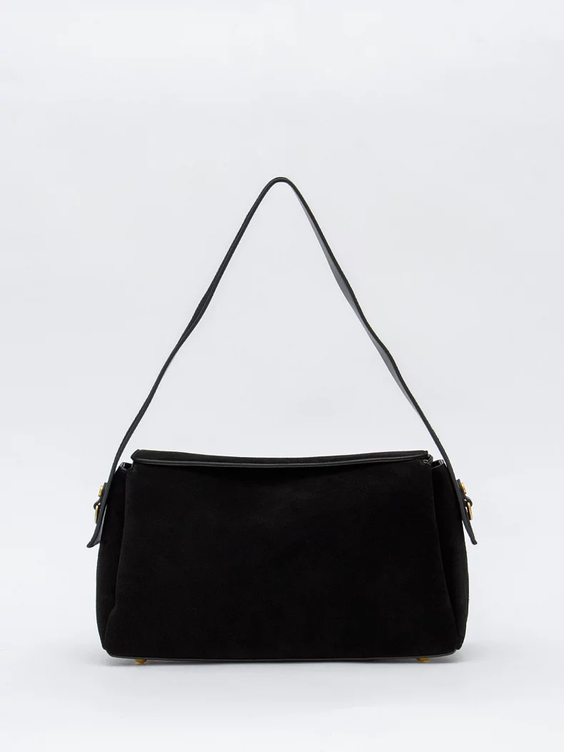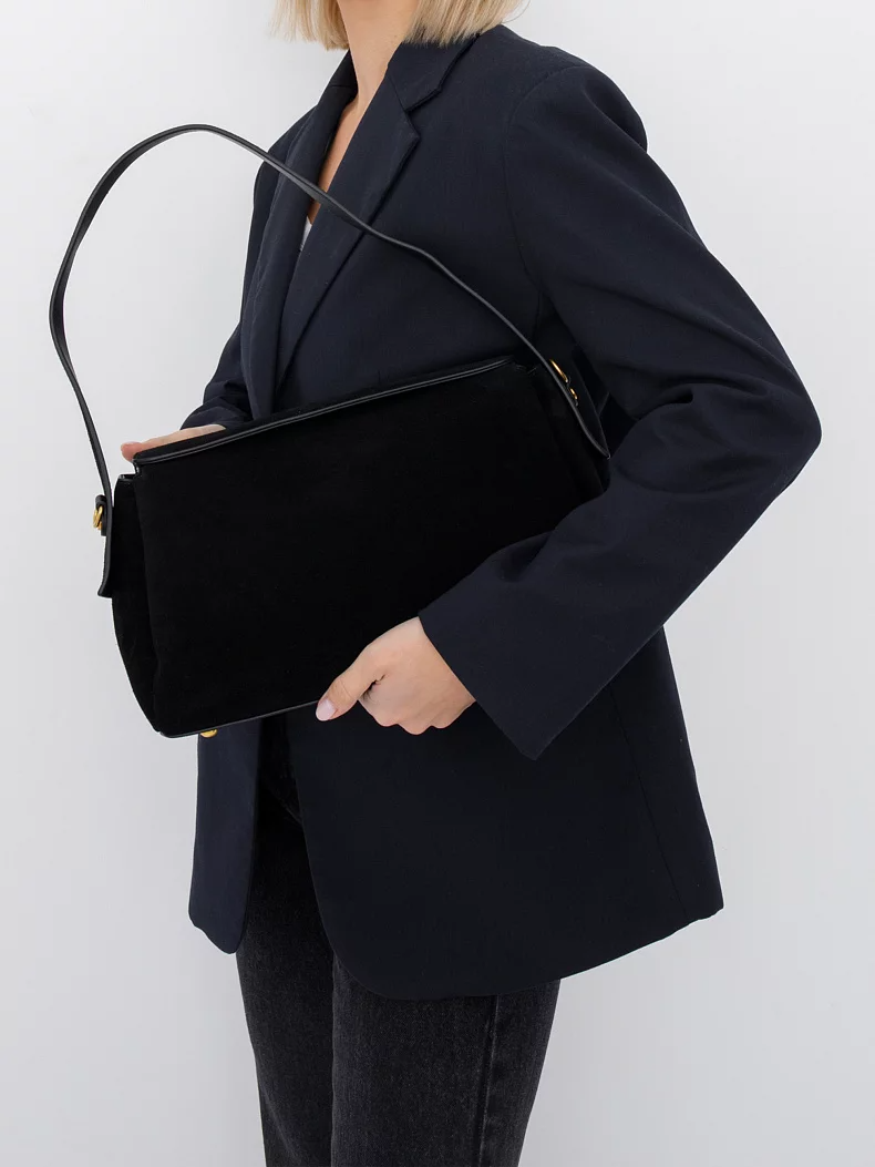 Трендовая модель, выполнена из замши. Дополнена золотистой фурнитурой. Данная модель закрывается на клапан, носится в руке за встроенную ручку или на плече. В комплекте имеется съемный ремень с регулировкой длины. Каркас полужесткий. На дне предусмотрены ножки.