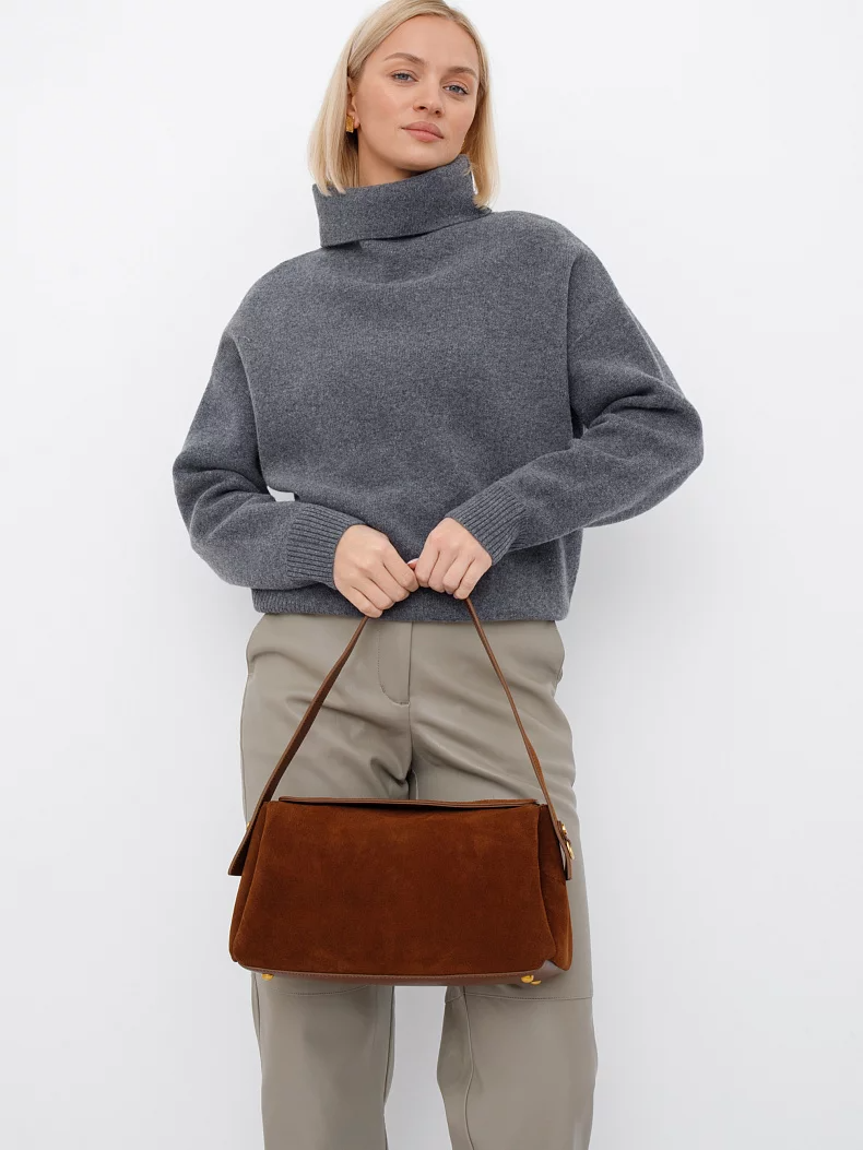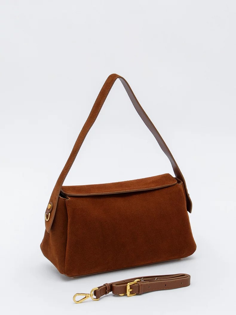 Трендовая модель, выполнена из замши. Дополнена золотистой фурнитурой. Данная модель закрывается на клапан, носится в руке за встроенную ручку или на плече. В комплекте имеется съемный ремень с регулировкой длины. Каркас полужесткий. На дне предусмотрены ножки.