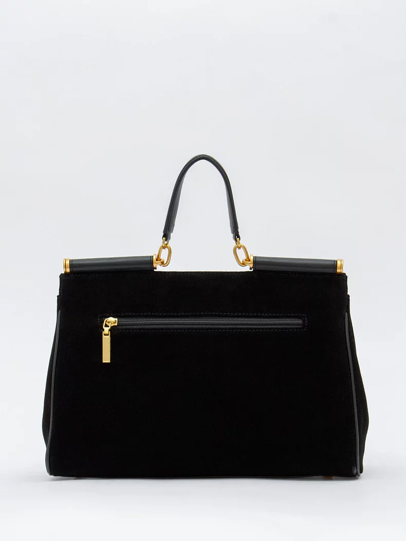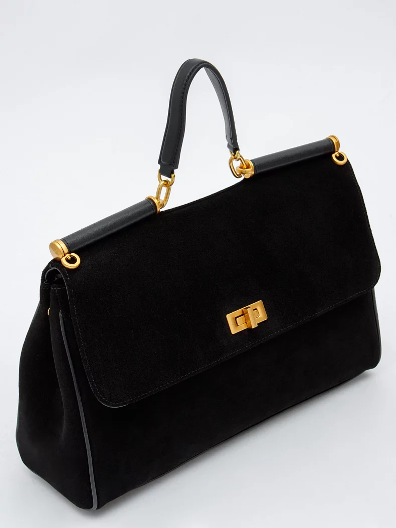 Сумка-сэтчел, выполнена из замши. Дополнена золотистой фурнитурой. Данная модель закрывается на клапан, носится в руке за встроенную ручку или на плече. В комплекте имеется ремень с регулировкой длины. Каркас полужёсткий. На дне предусмотрены ножки.