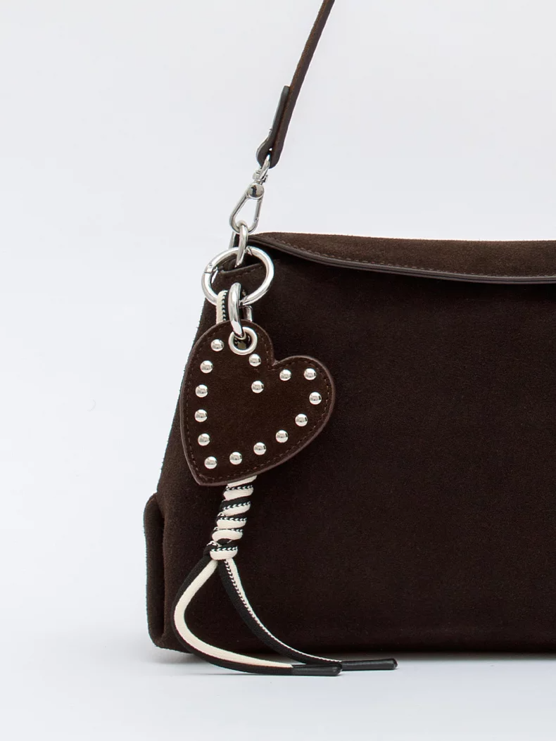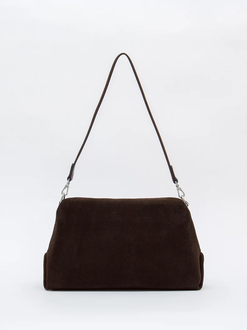 Стильная сумка, выполнена из натуральной замши. Декорирована съемным брелоком. Дополнена серебристой фурнитурой. Данная модель закрывается на клапан, носится в руке за съемную ручки. Или на плече, в комплекте имеется ремень с регулировкой длины. Каркас полужесткий.