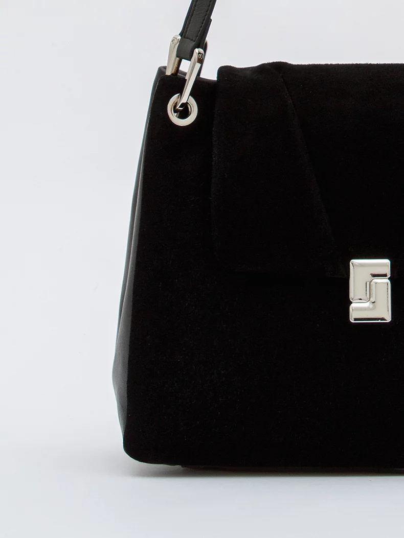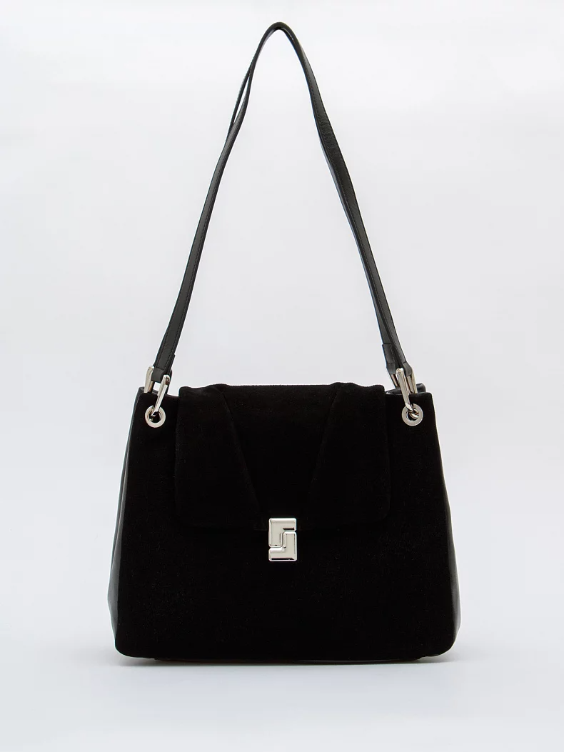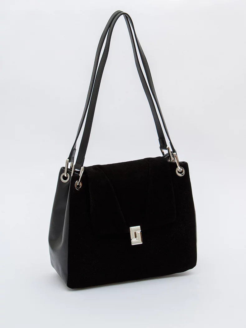 Базовая модель, выполнена из натуральной замши и кожи. Дополнена серебристой фурнитурой. Данная модель закрывается на клапан, носится в руке за встроенные ручки. Каркас полужесткий.