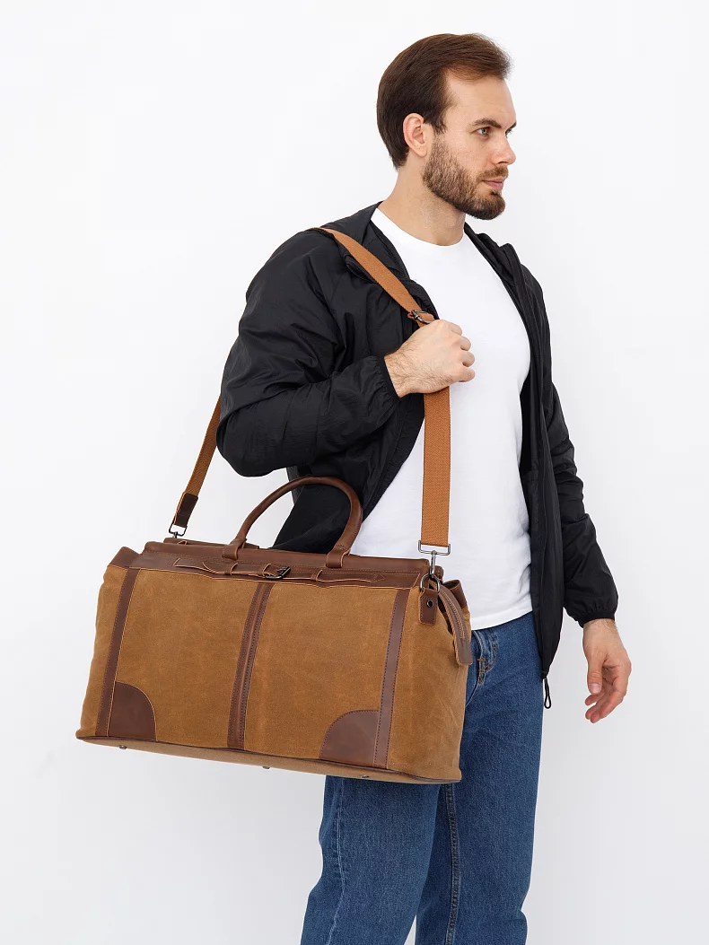 Дорожная сумка, выполнена из брезента. Дополнена темной серебристой фурнитурой. Данная модель закрывается на молнию, носится в руке или на плече с помощью ремня. В комплекте предусмотрен ремень-стропа с регулировкой длины. А так же встроенные ручки. Каркас мягкий.