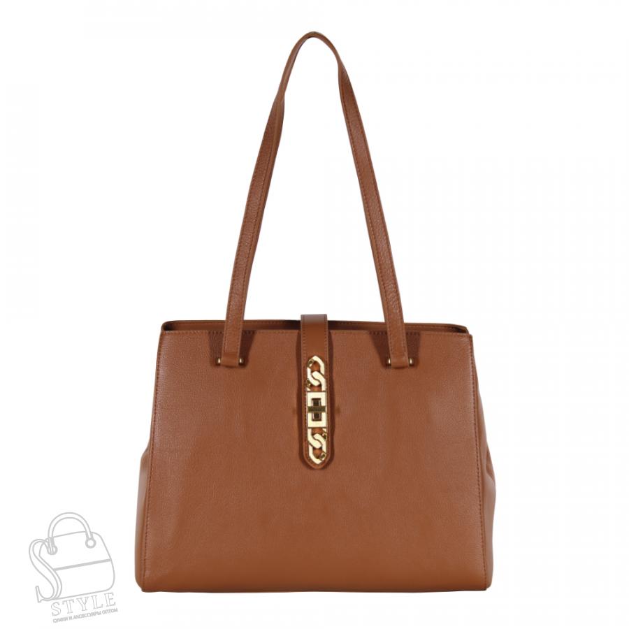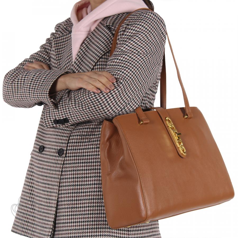 Базовая сумка, выполнена из натуральной кожи.  Дополнена золотистой фурнитурой. Данная модель закрывается на хлястик, носится на плече или в руке. В комплекте предусмотрены встроенные удлиненные ручки. Каркас полужесткий.