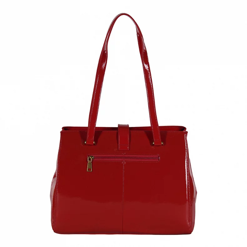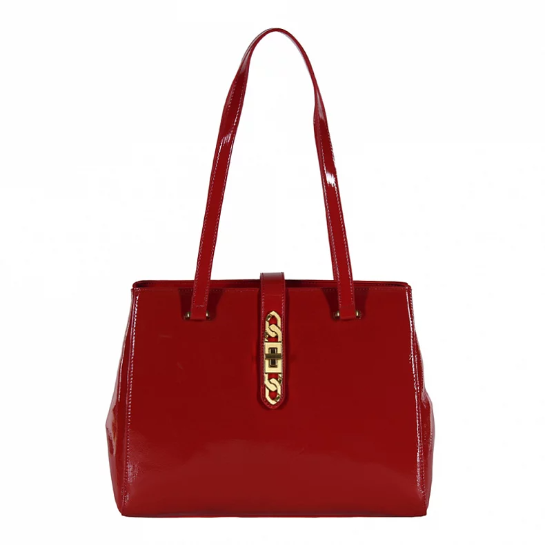 Шикарная сумка выполнена из лаковой натуральной кожи, декорирована пряжкой. Дополнена золотистой фурнитурой. Данная модель закрывается на молнию, носится на сгибе руки или на плече с помощью встроенных ручек. Каркас жесткий. На дне предусмотрены ножки.