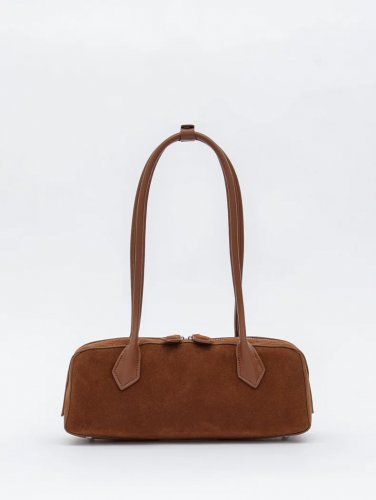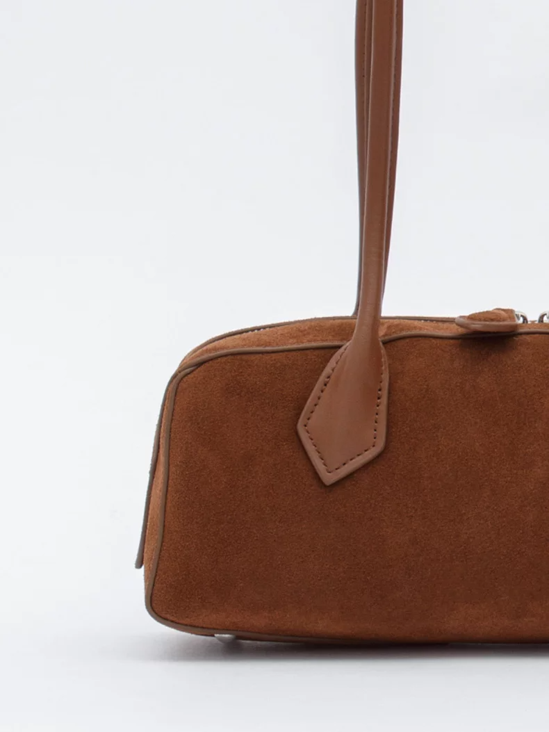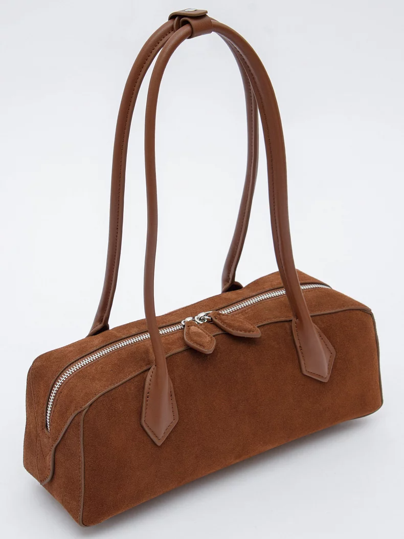 Сумка-такса, выполнена из замши. Дополнена серебристой фурнитурой. Данная модель закрывается на молнию. Каркас полужёсткий. Носится сумка в руке за встроенные ручки.