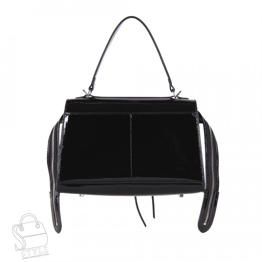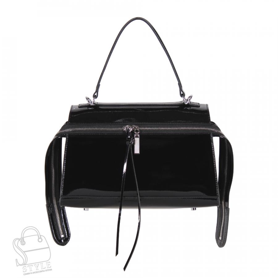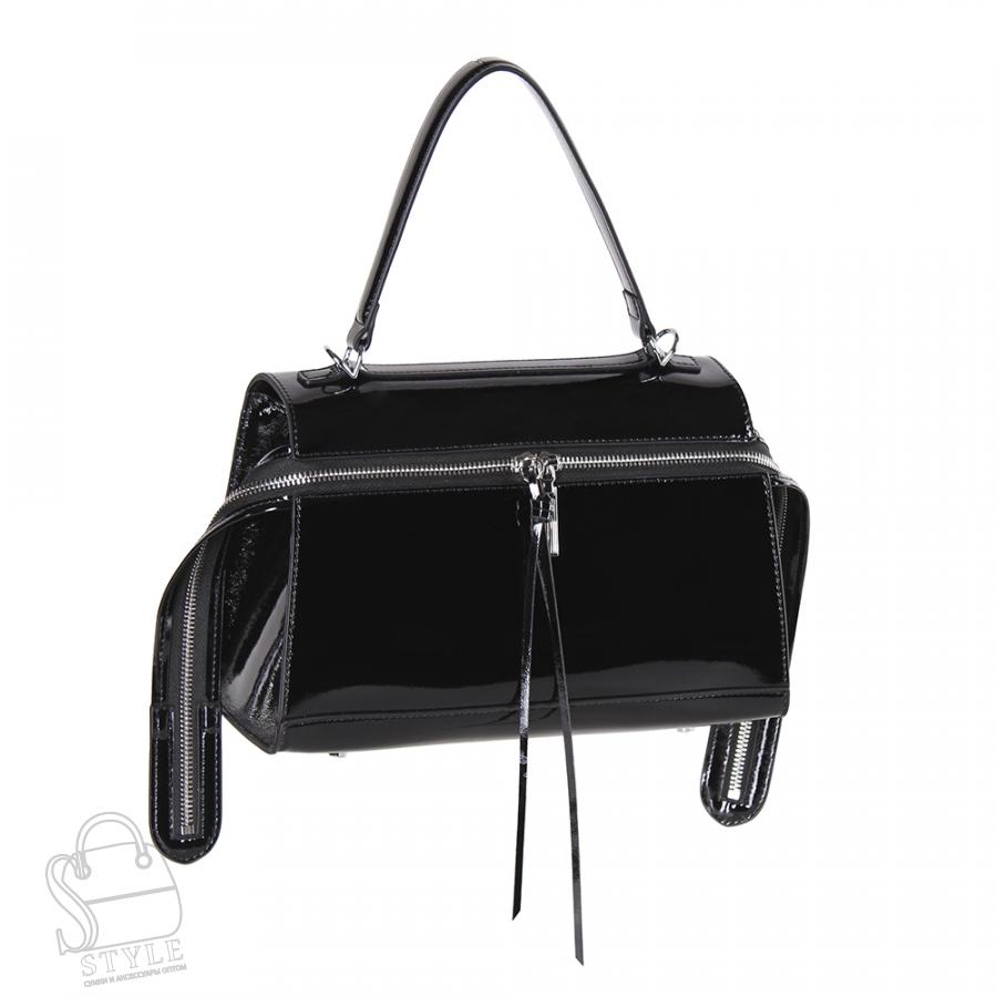 Модель среднего размера, выполнена из натуральной лаковой кожи. Декорирована брелоком. Дополнена серебристой фурнитурой. Данная модель закрывается на удлиненную молнию. Каркас мягкий. Носится в руке за встроенные удлиненные ручки и на плече. В комплекте имеется съемный широкий ремень без регулировки. На дне предусмотрены ножки.