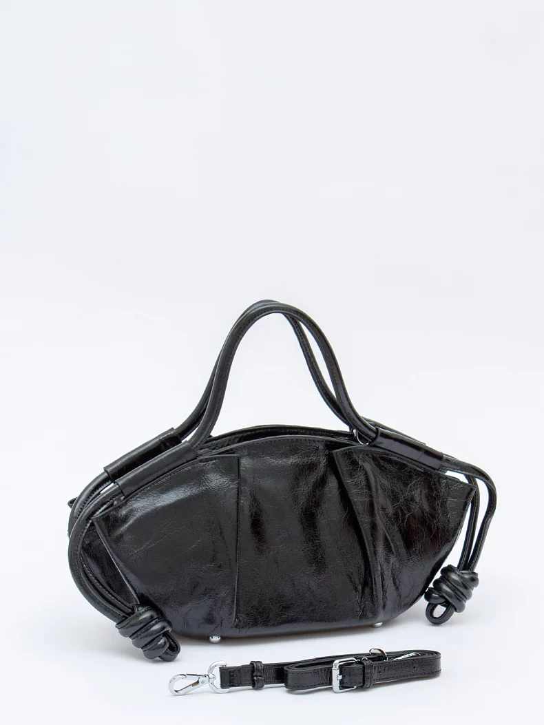 Сумка в форме лодочка, выполнена из натуральной кожи. Дополнена серебристой фурнитурой.  Данная модель закрывается на молнию. Носится на в руке за встроенную ручку или на плече, съемный ремень регулируется по длине. Каркас мягкий. На дне предусмотрены ножки.
