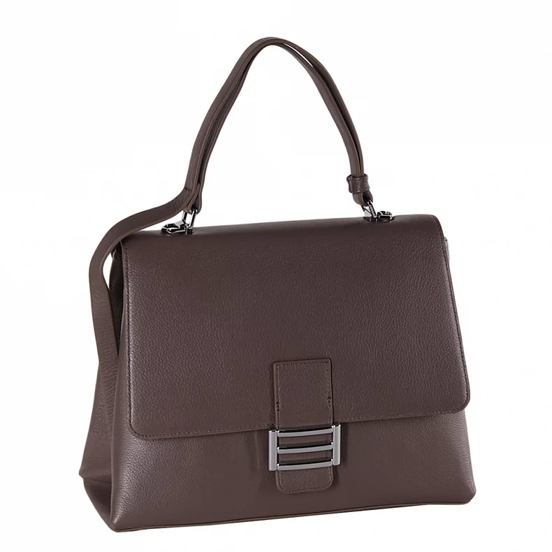 Базовая модель сумки-сэчел, выполнена из натуральной кожи. Декорирована пряжкой на клапане. Дополнена серебристой фурнитурой. Данная модель закрывается на клапан, носится на плече или через плечо с помощью ремня, а так же в руке за ручку. Каркас полужесткий. На дне предусмотрены ножки для устойчивости.