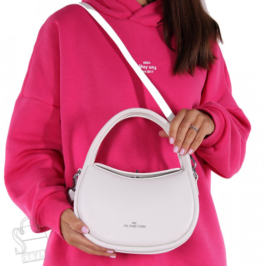 Сумка в форме полумесяц, выполнена из натуральной кожи. Декорирована надписью на передней части. Дополнена серебристой фурнитурой. Данная модель закрывается на клапан. Каркас полужесткий. В комплекте съемный ремень с регулировкой длины.