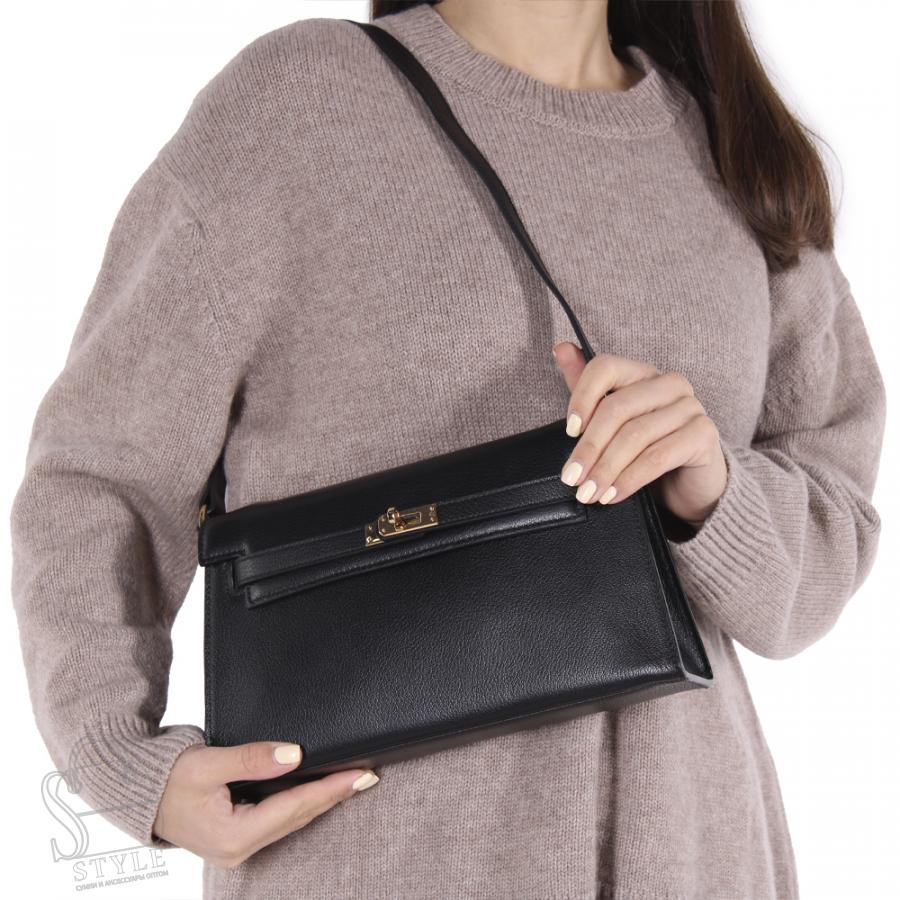 Небольшая базовая модель, выполнена из натуральной кожи.  Дополнена золотистой фурнитурой. Данная модель закрывается на клапан. Каркас жесткий. Носится через плечо за ремень, либо встроенную длинную ручку. Плечевой ремень регулируется по длине.