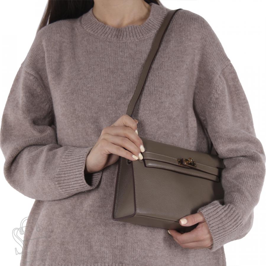 Небольшая базовая модель, выполнена из натуральной кожи.  Дополнена золотистой фурнитурой. Данная модель закрывается на клапан. Каркас жесткий. Носится через плечо за ремень, либо встроенную длинную ручку. Плечевой ремень регулируется по длине.