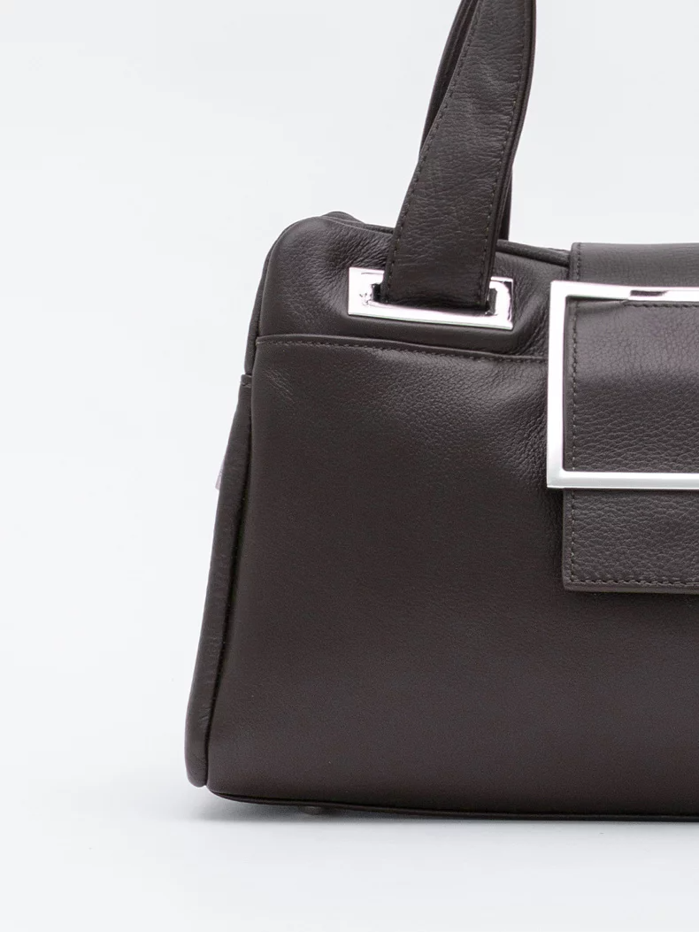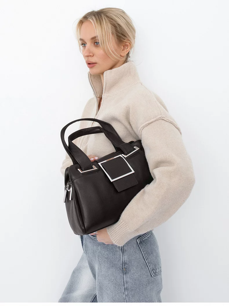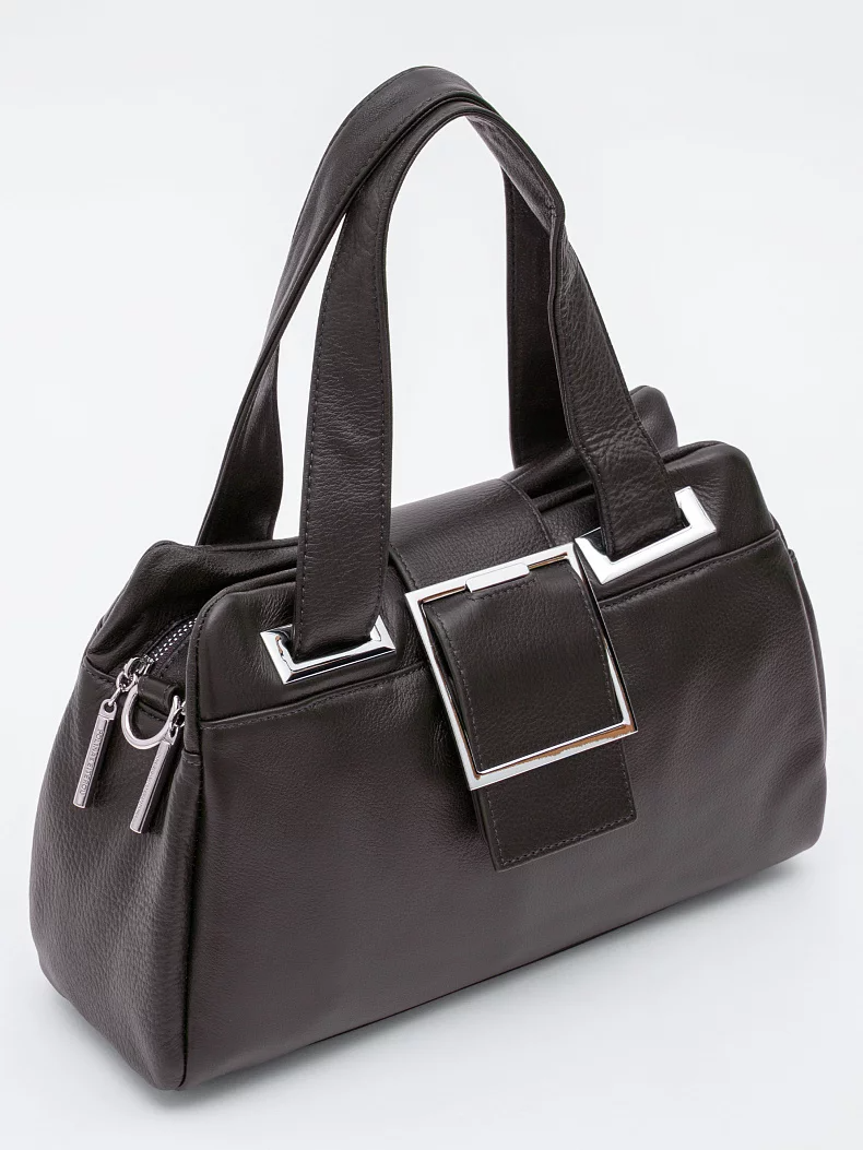 Функциональная модель, выполнена из кожи. Декорирована пряжкой на хлястике.  Дополнена серебристой фурнитурой. Данная модель закрывается на хлястик. Каркас мягкий. Носится в руке за съёмную ручку или на плече. В комплекте имеется съемный ремень с регулировкой длины.