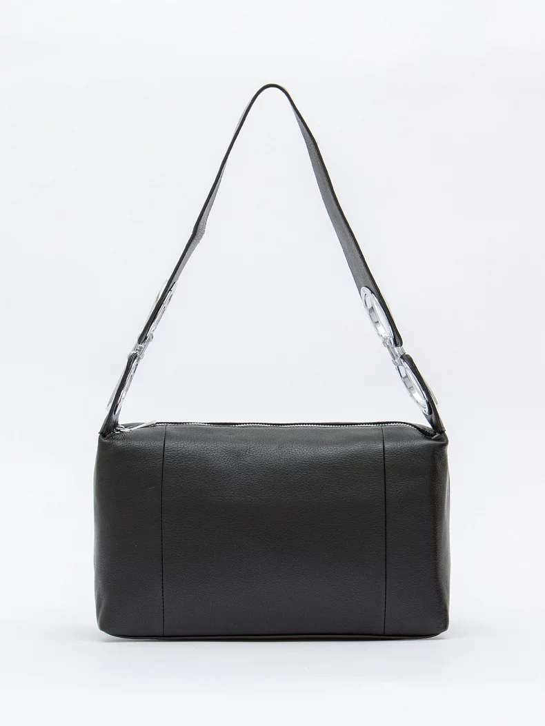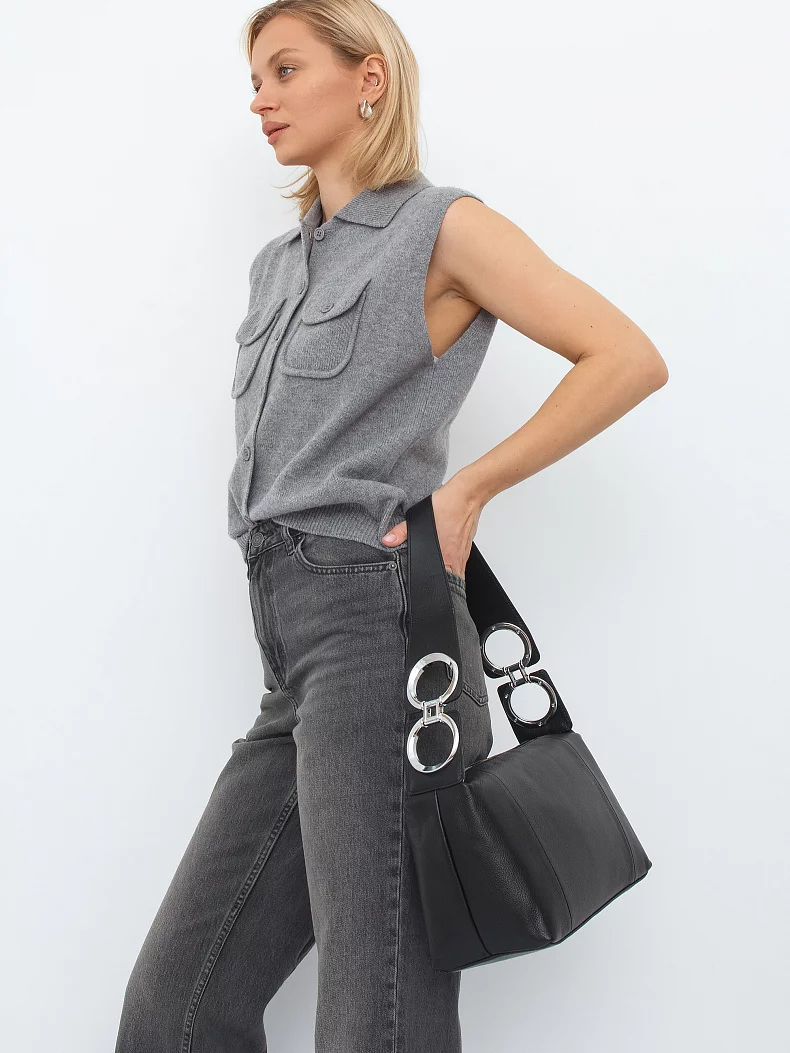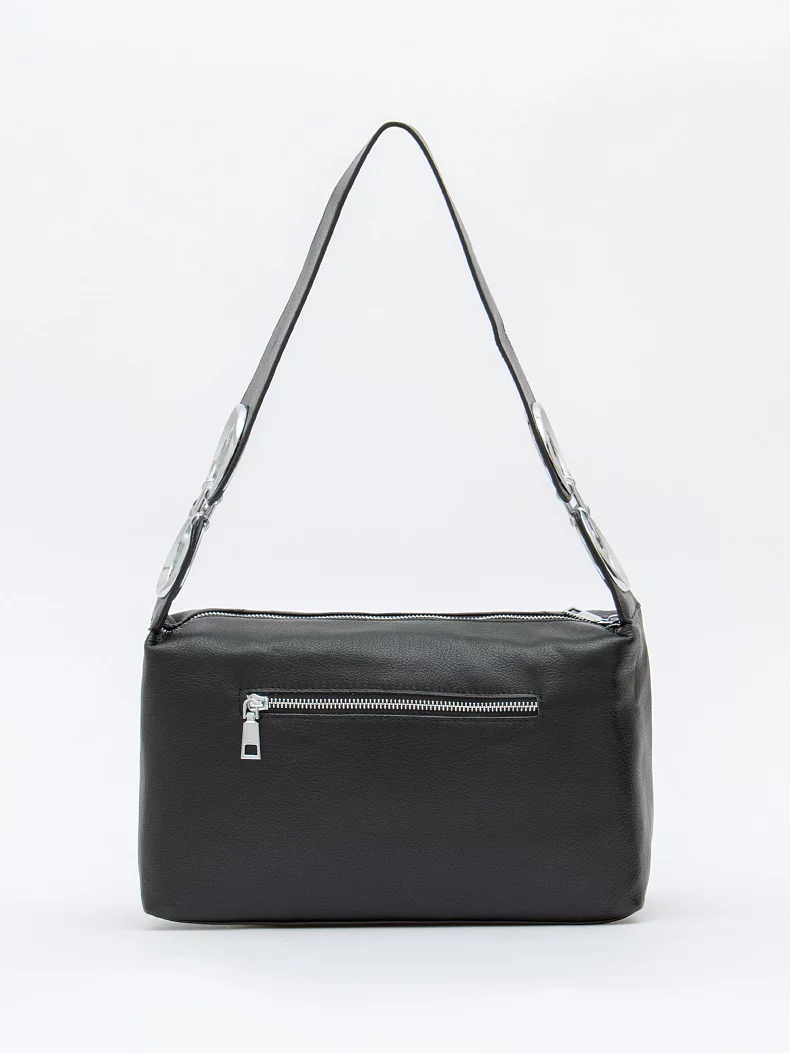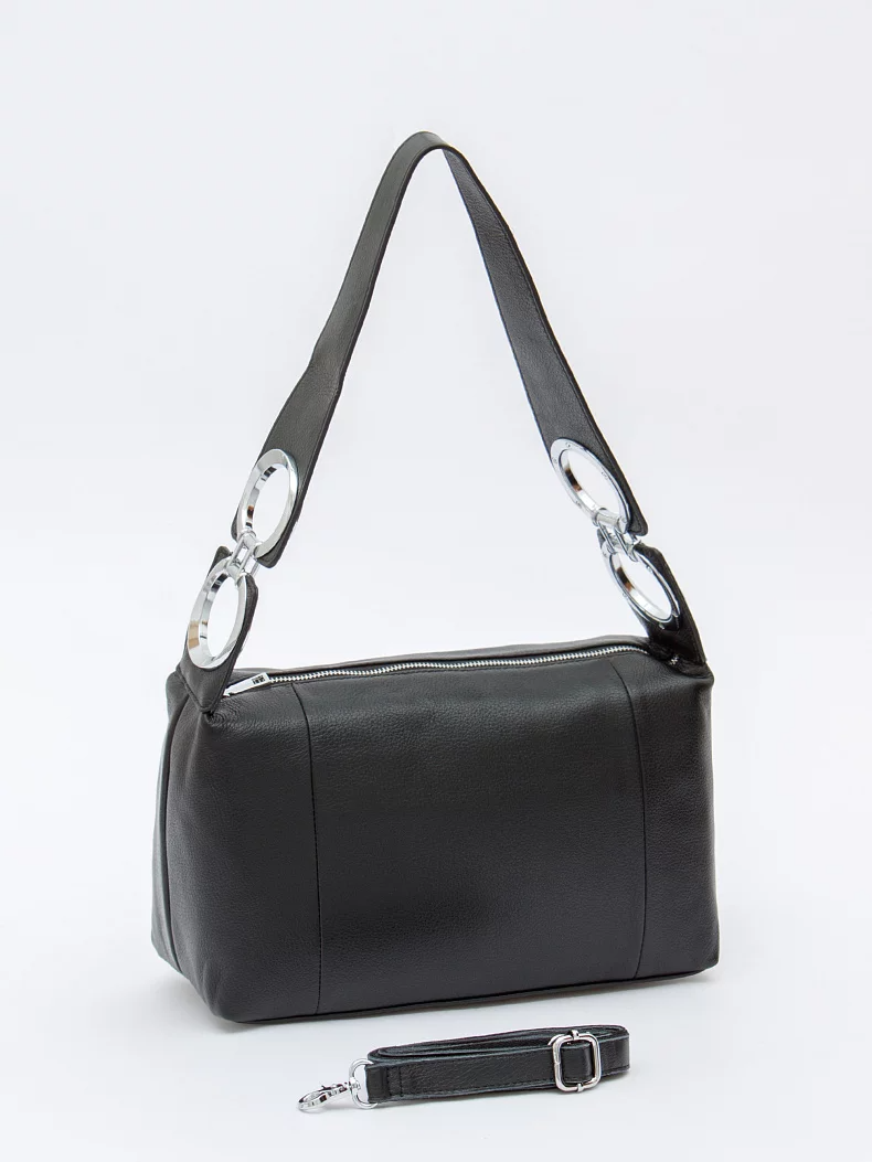 Базовая сумка, выполнена из кожи с эффектной ручкой. Дополнена серебристой фурнитурой. Данная модель закрывается на молнию. Каркас мягкий. Носится в руке за встроенную ручку или на плече. В комплекте имеется съемный ремень с регулировкой длины.