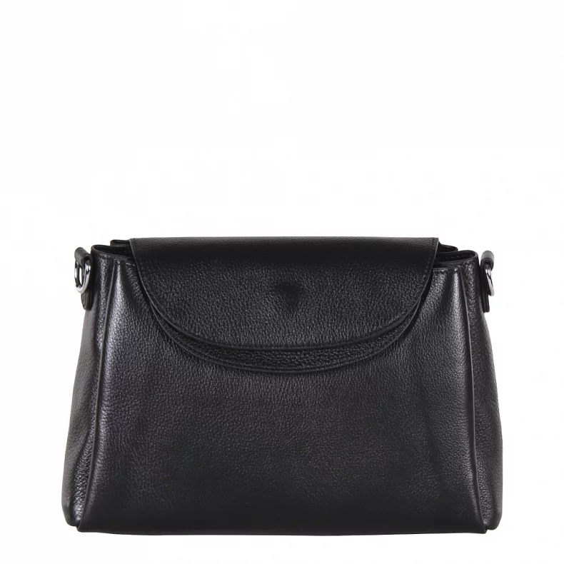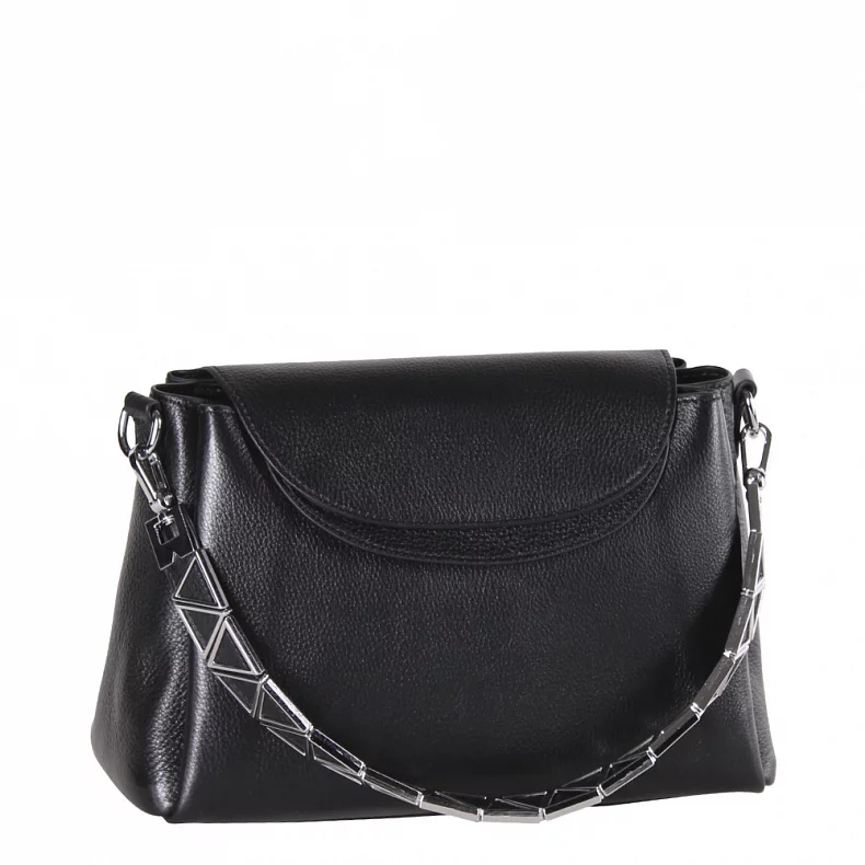 Модель кросс-боди, выполнена из натуральной кожи. Дополнена  серебристой фурнитурой. Данная модель закрывается на клапан. Каркас полужесткий. Носится на плече. В комплекте имеется съемный ремень с регулировкой длины. Или в руке за съемную ручку.
