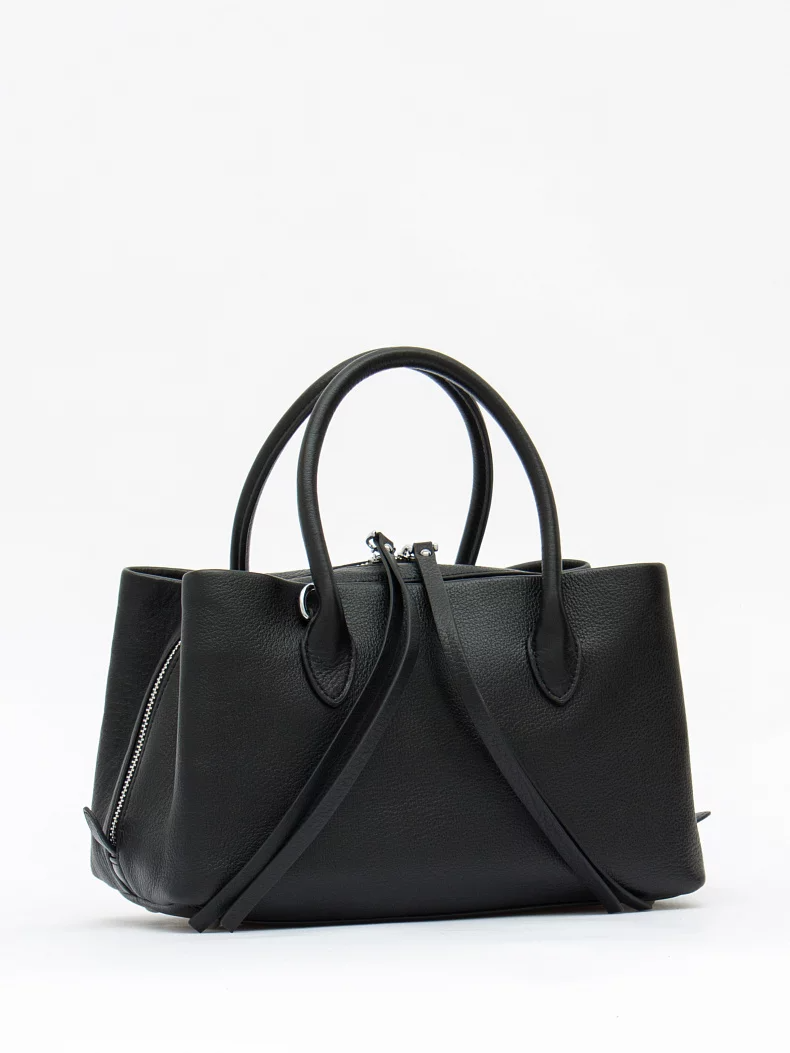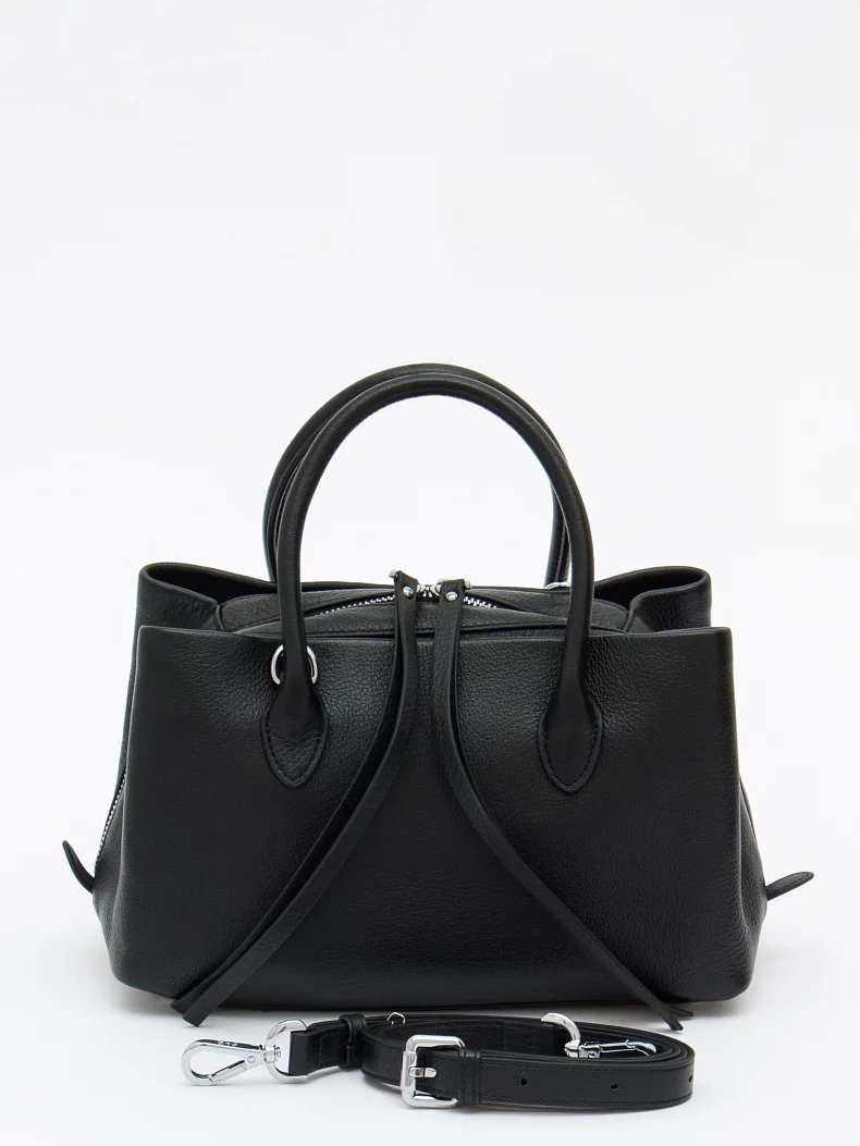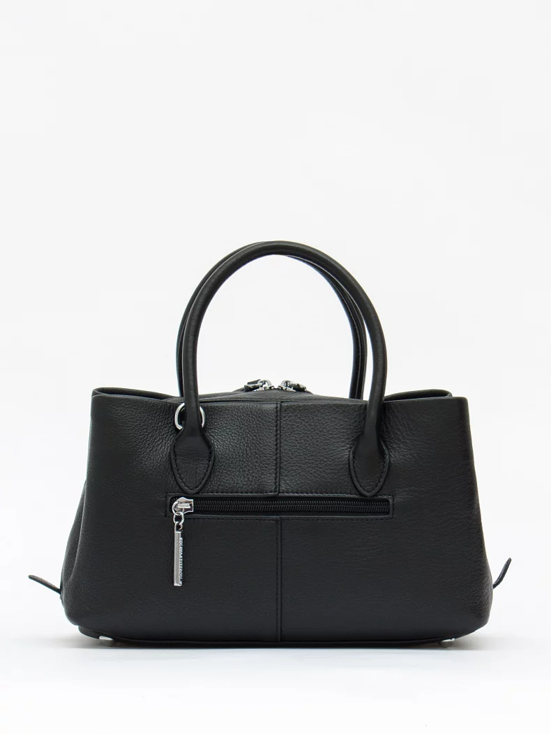 Элегантная сумка, выполнена из натуральной кожи. Декорирована эффектными "собачками". Дополнена серебристой фурнитурой. Данная модель закрывается на молнию. Каркас полужесткий. Носится на плече за съемный ремень с регулировкой длины. Или в руке за встроенные ручки. На дне предусмотрены ножки.