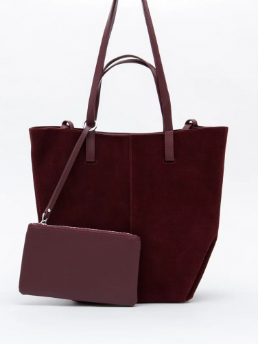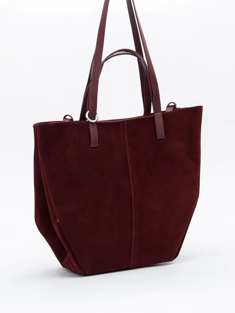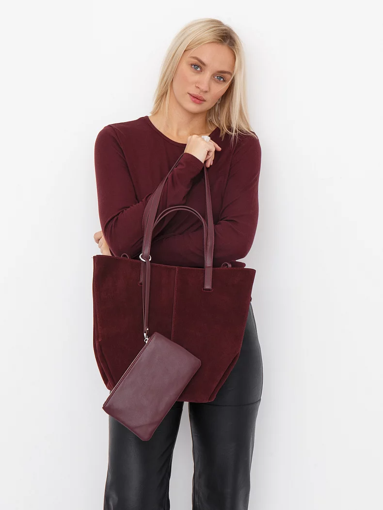 Трендовая модель с альтернативными ручками, выполнена из замши. Дополнена серебристой фурнитурой. Данная модель закрывается на молнию. Каркас полужесткий. Носится за короткие или длинные встроенные ручки. В комплекте имеется съемная косметичка.