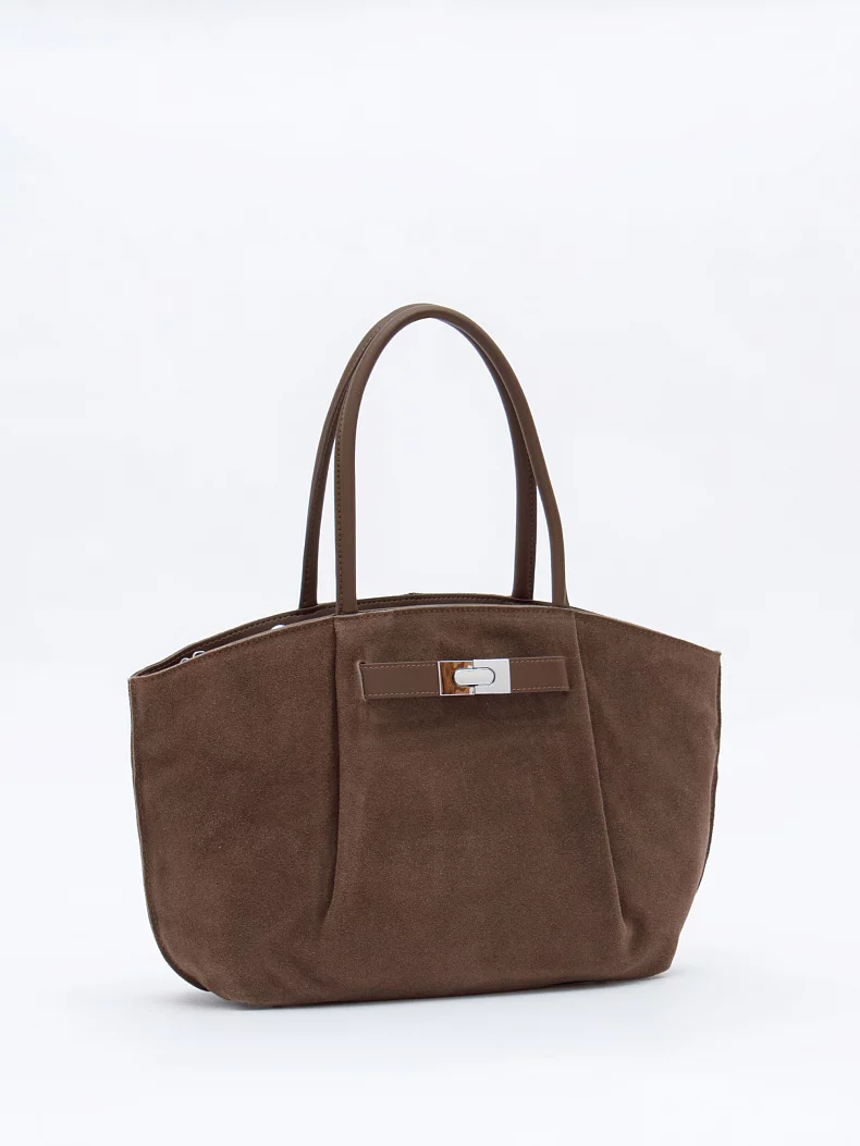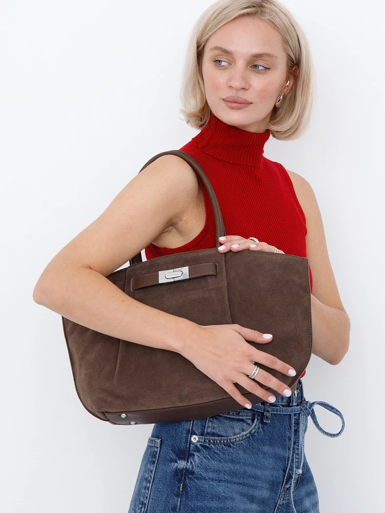 Сумка трендовой формы, выполнена из замши. Дополнена серебристой фурнитурой. Данная модель закрывается на молнию, носится в руке за встроенные ручки. Или на плече ,в комплекте имеется ремень с регулировкой длины. Каркас полужесткий.