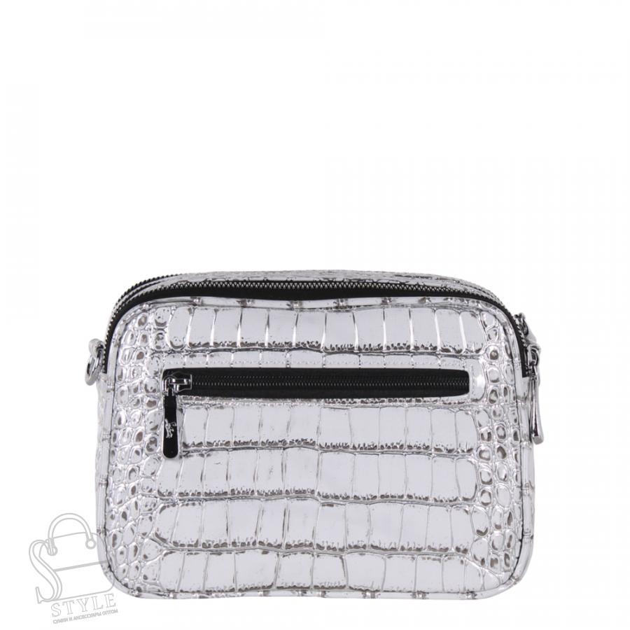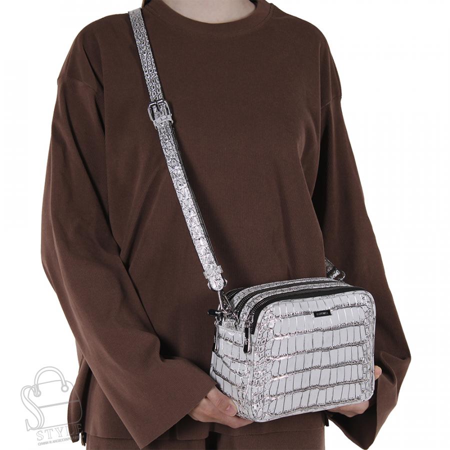 Модель кросс-боди, выполнена из экокожи. Дополнена  серебристой фурнитурой. Данная модель закрывается на молнию. Каркас полужесткий. Носится на плече. В комплекте имеется съемный ремень с регулировкой длины.