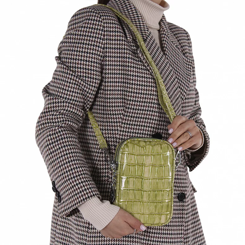 Сумка кросс-боди, выполнена из экокожи. Декорирована фактурой под рептилию. Дополнена серебристой фурнитурой. Данная модель закрывается на молнии, носится на плече. В комплекте есть съемные ремни с регулировкой длины. Каркас жесткий.
