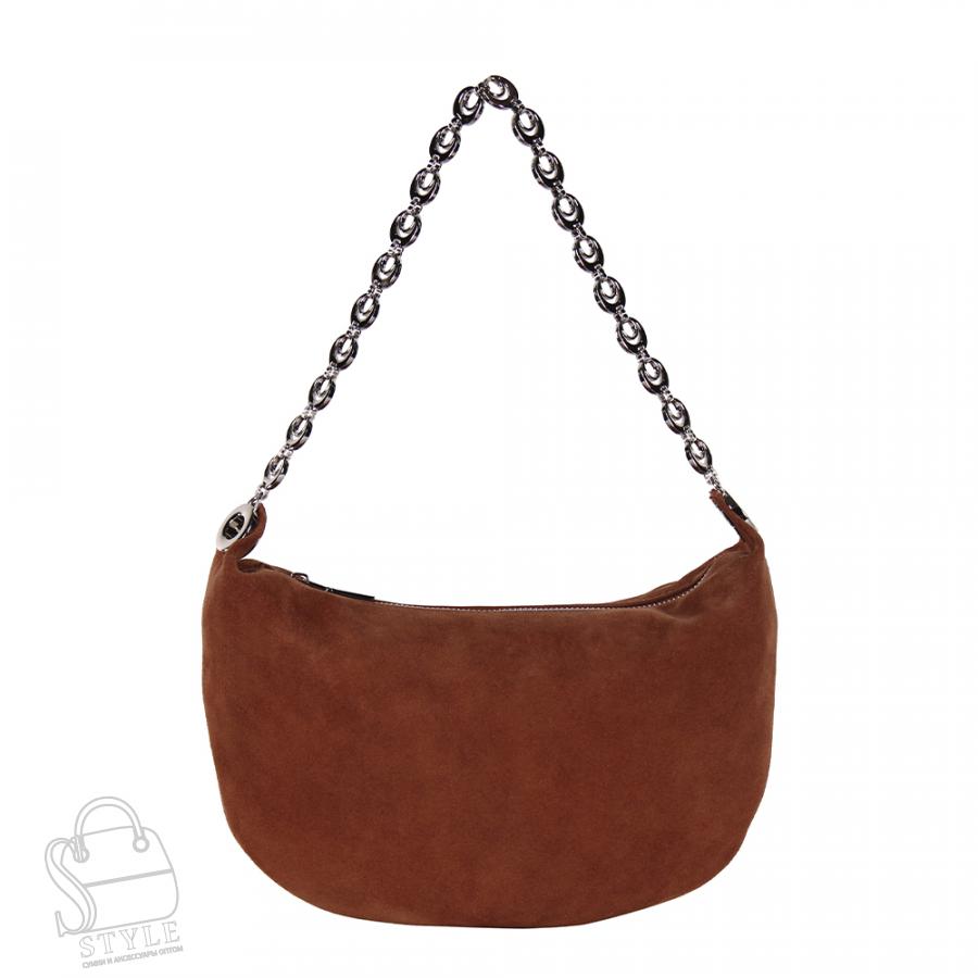 Сумка-бананка, выполнена из замши. Декорирована цепочкой. Дополнена серебристой фурнитурой. Данная модель закрывается на молнию. Каркас мягкий. Носится в руке или на плече. Съемный ремень регулируется по длине.