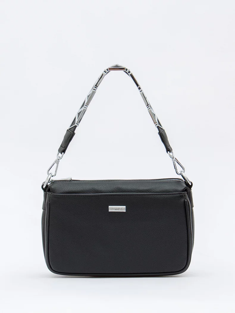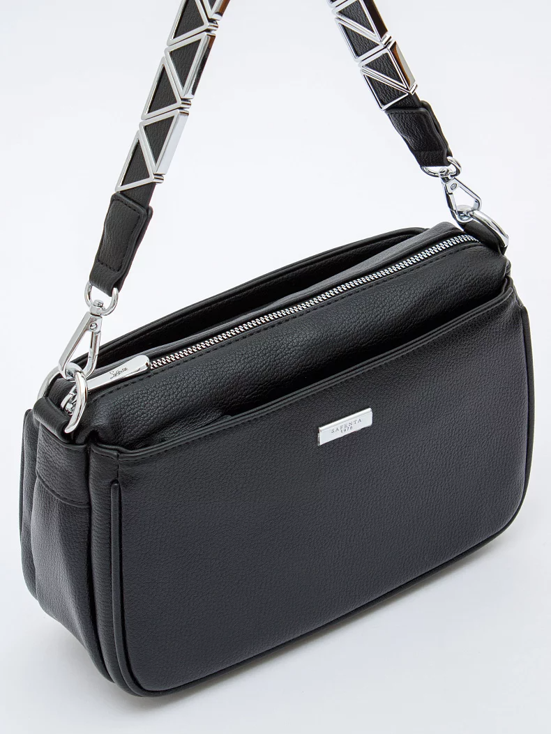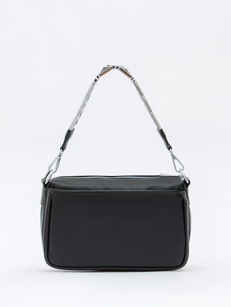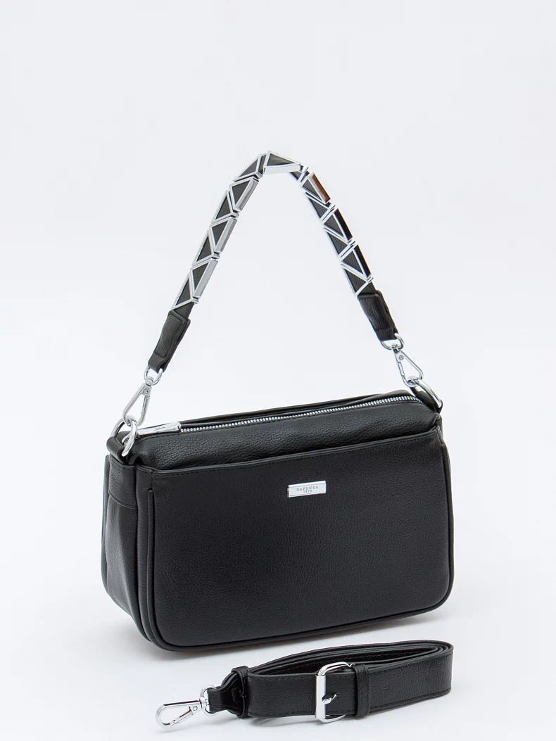 Модель кросс-боди, выполнена из экокожи. Дополнена серебристой фурнитурой. Данная модель закрывается на молнию. Каркас полужесткий. Носится в руке за съемную эффектную ручку или на плече. В комплекте имеется съемный ремень с регулировкой длины.