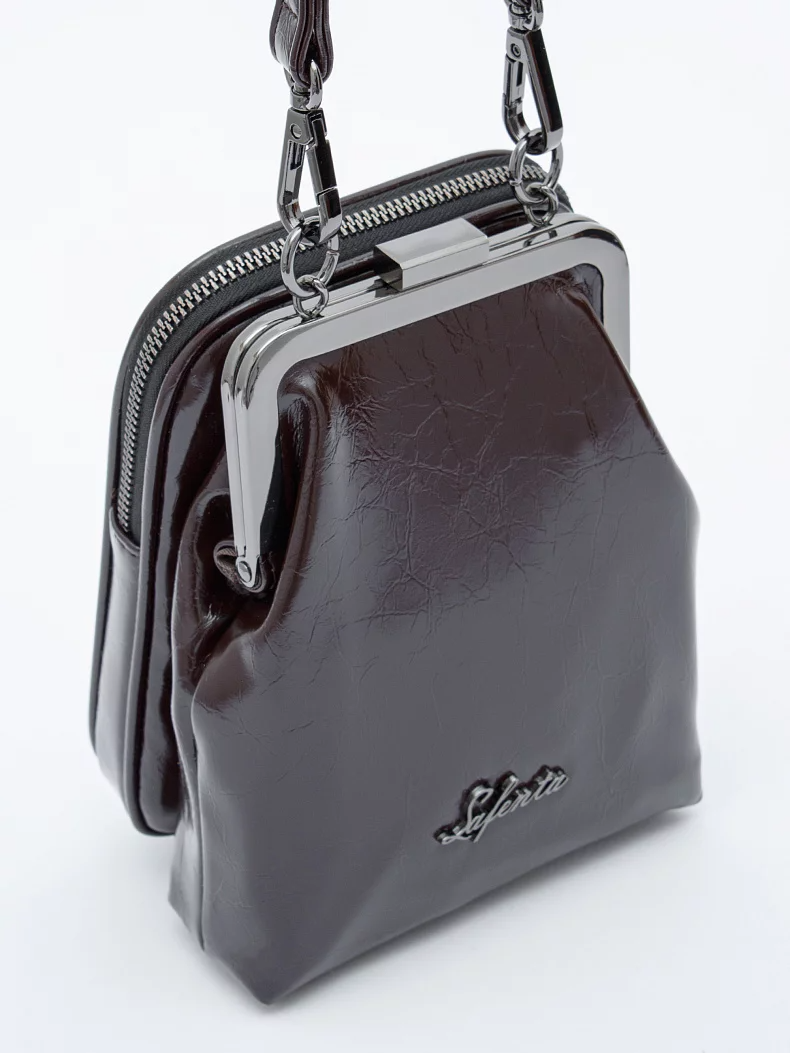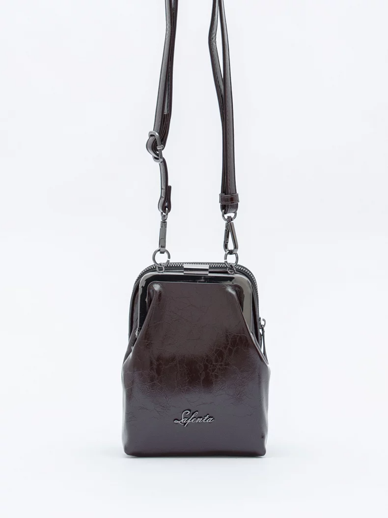 Сумка кросс-боди, выполнена из экокожи. Дополнена серебристой темной фурнитурой.  Данная модель закрывается на молнию и на фермуар. Носится на плече, съемный ремень регулируется по длине. Каркас полужесткий.