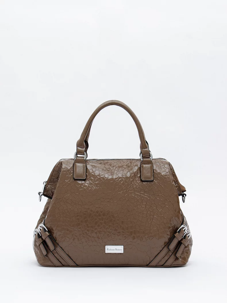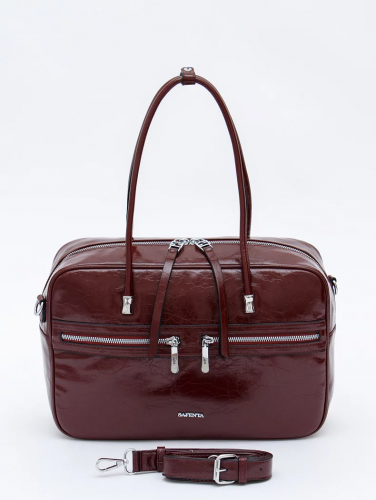 Функциональная сумка, выполнена из экокожи. Декорирована ремнями на передней части. Дополнена серебристой фурнитурой. Данная модель закрывается на молнию. Каркас мягкий. Носится в руке за встроенные ручки или на плече. В комплекте имеется съемный ремень с регулировкой длины.