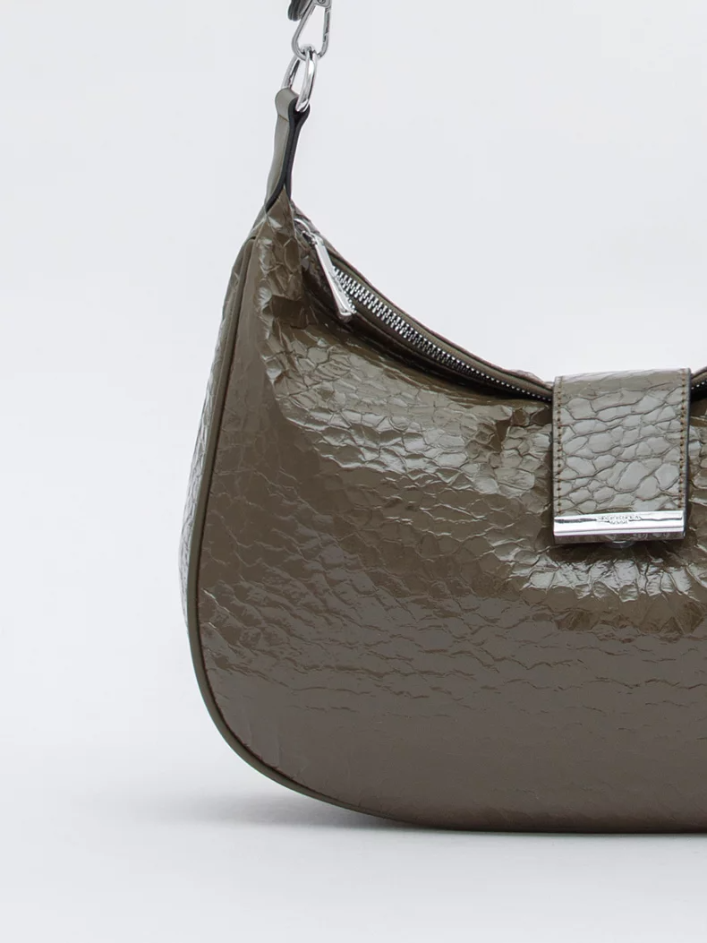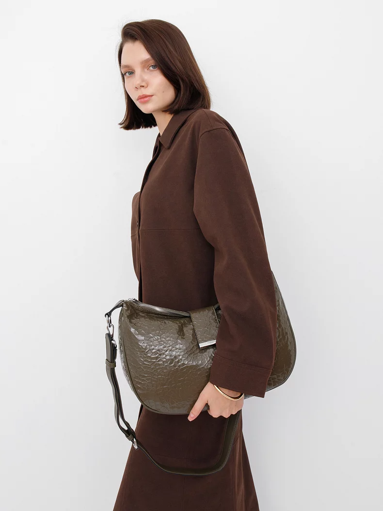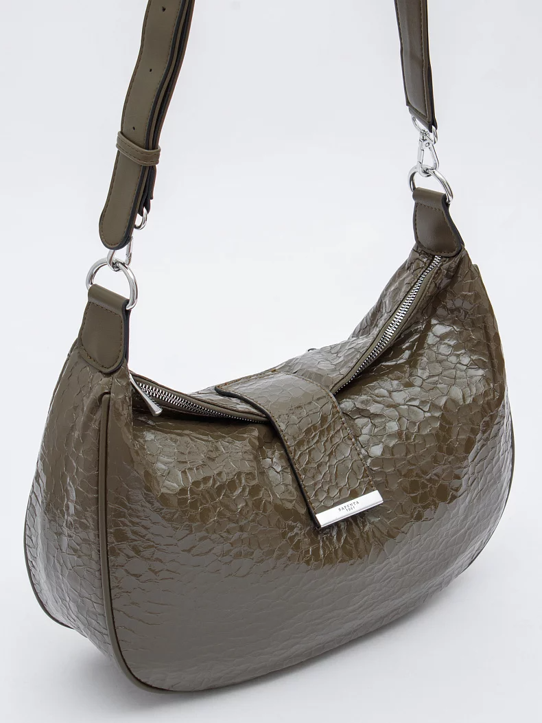 Модель на длинном плечевом ремне, выполнена из экокожи. Декорирована логотипом на передней части. Дополнена серебристой фурнитурой. Данная модель закрывается на хлястик. Каркас мягкий. Носится на плече или через плечо. В комплекте имеется съемный ремень с регулировкой длины.