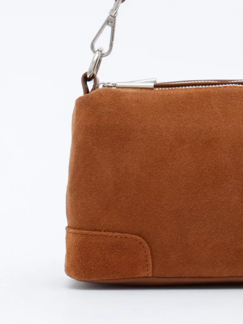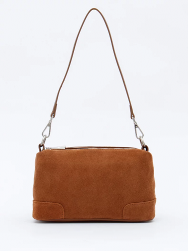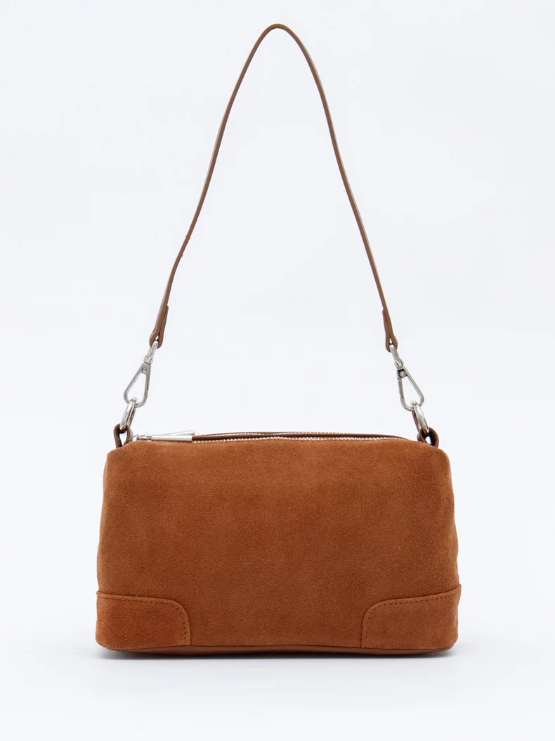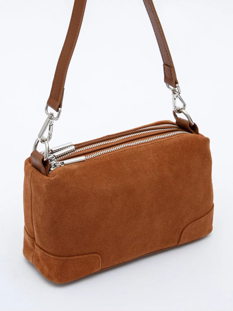Функциональная сумка, выполнена из замши. Дополнена серебристой фурнитурой. Данная модель закрывается на молнии, носится в руке или на плече. В комплекте имеется съемная удлиненная ручка и плечевой ремень с регулировкой длины. Каркас полужесткий.
