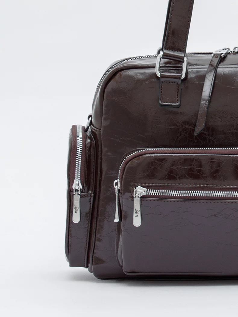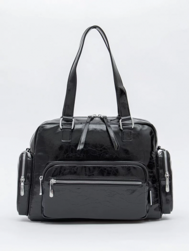 Функциональная сумка, выполнена из экокожи. Дополнена серебристой фурнитурой. Данная модель закрывается на молнию. Каркас полужесткий. Носится в руке за встроенные удлиненные ручки, или на плече. В комплекте имеется съемный ремень с регулировкой длины.