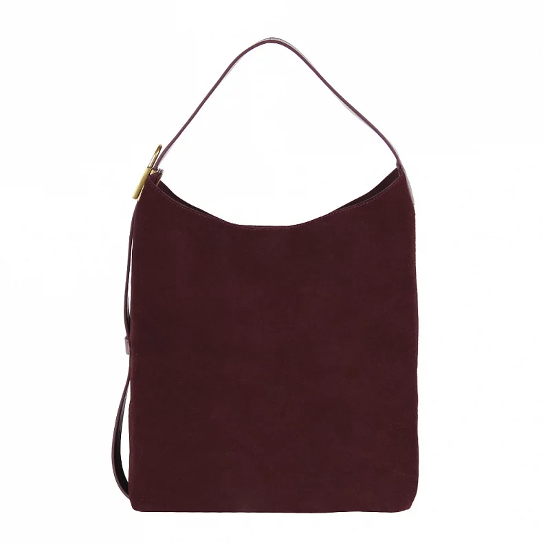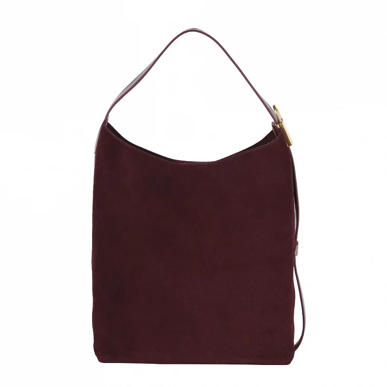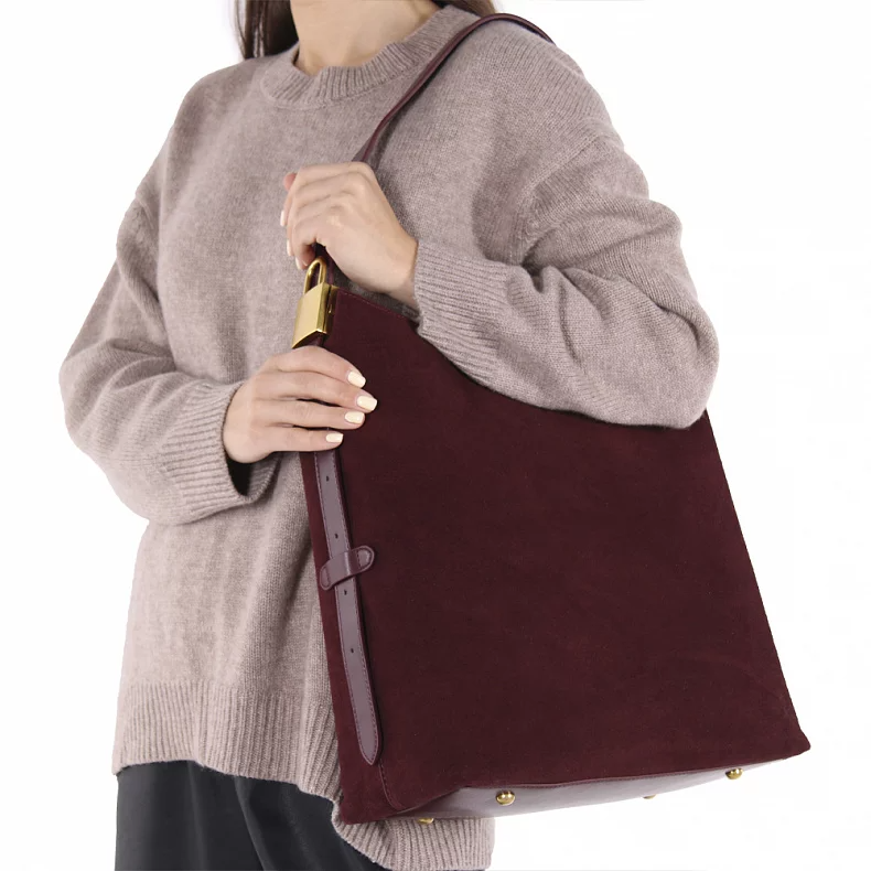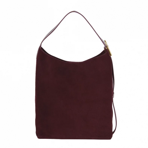 Вместительная модель, выполнена из натуральной замши. Декорирована пряжкой на передней части.  Дополнена золотистой фурнитурой. Данная модель закрывается на магнитную кнопку. Каркас полужесткий. Носится через плечо или в руке. Встроенная ручка регулируется по длине.